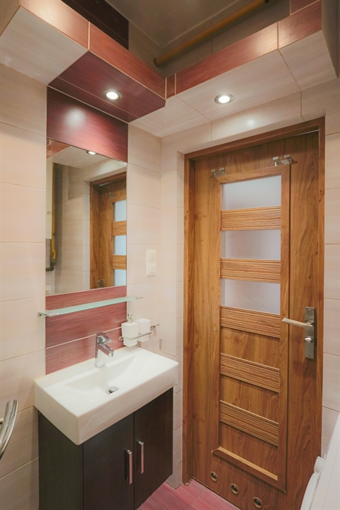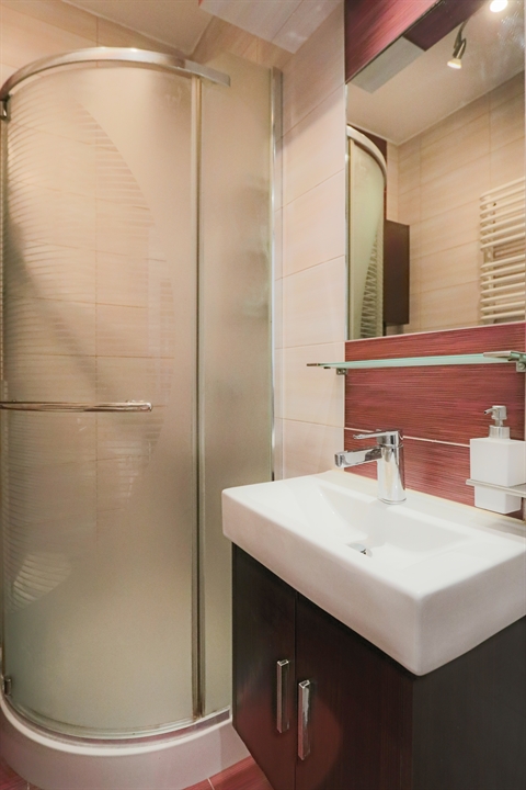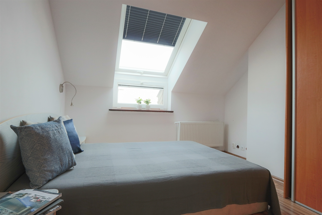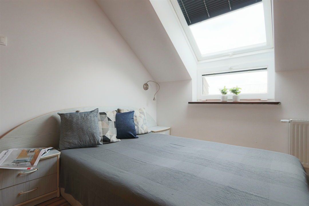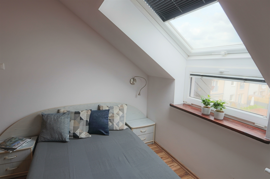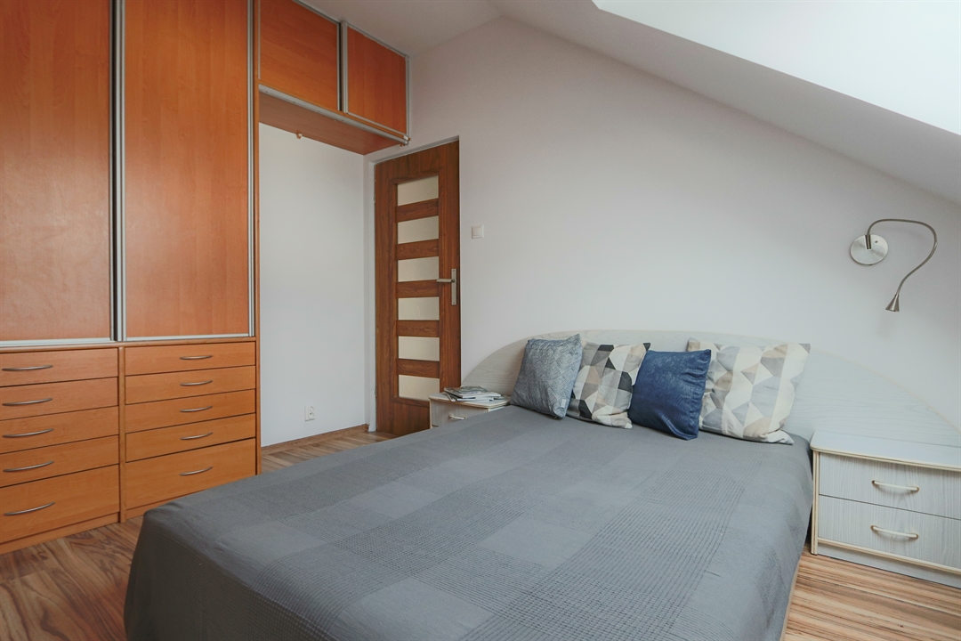 W sypialni znajduje się duża zabudowa typu komandor, dająca wiele miejsca na przechowywanie rzeczy osobistych lokatorów.