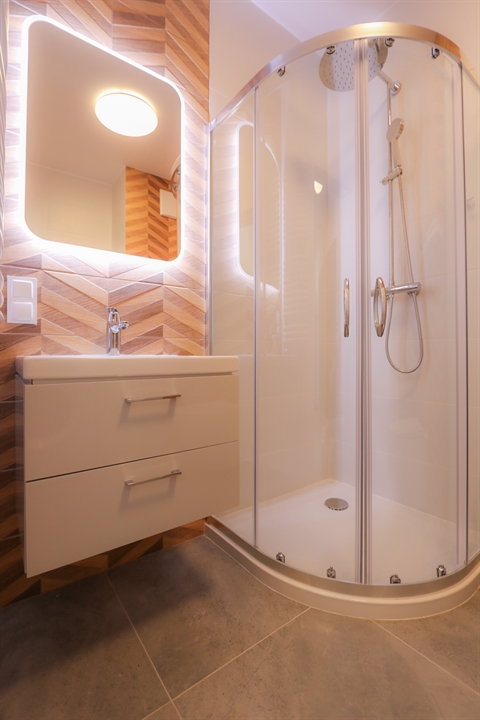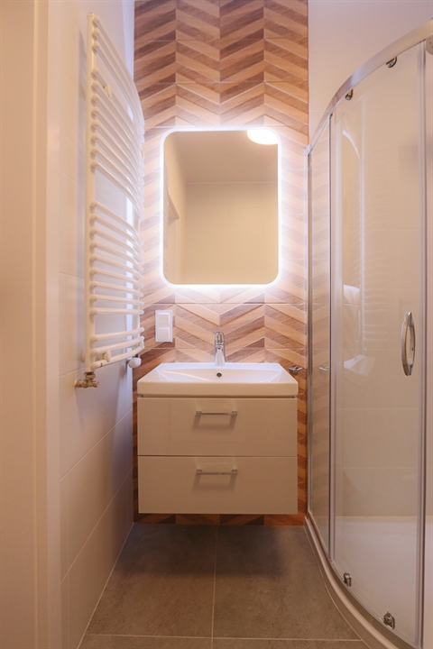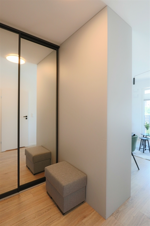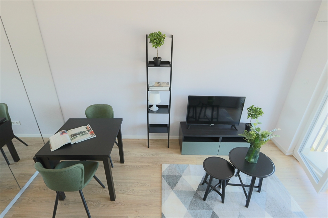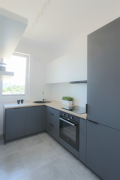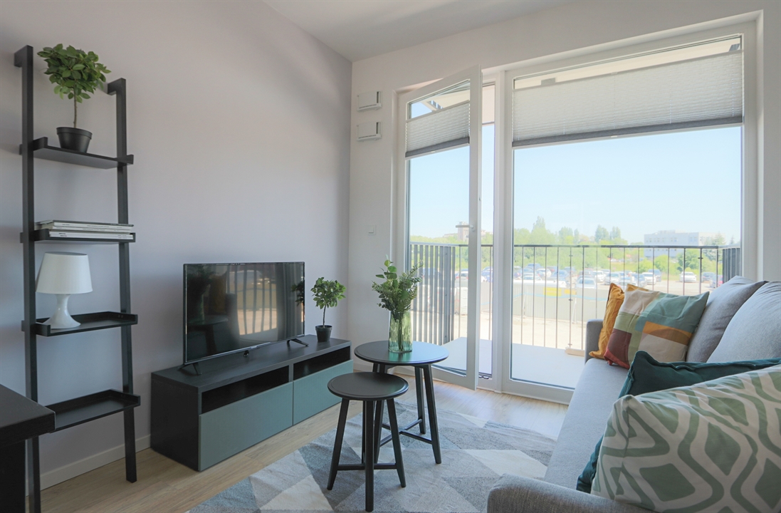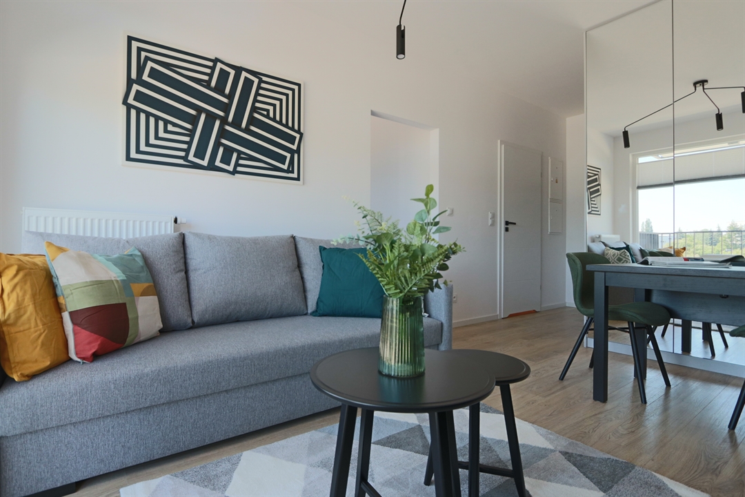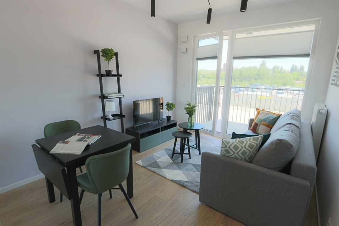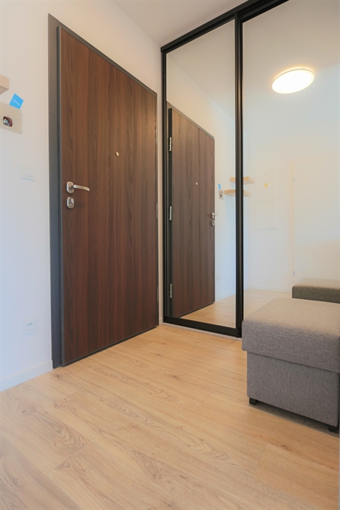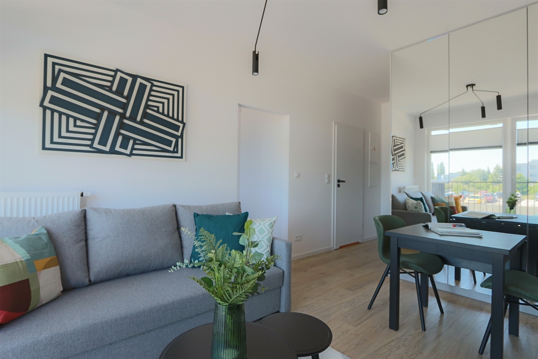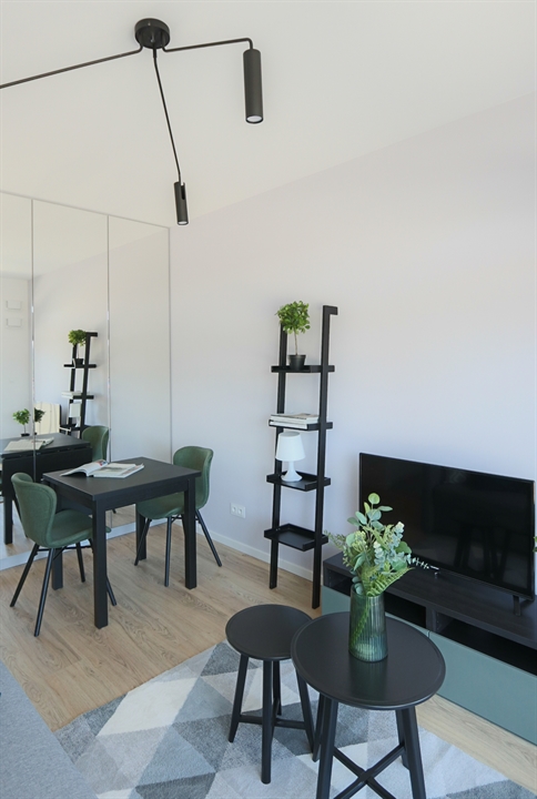 W pełni umeblowana i wyposażona kawalerka o wysokim standardzie, idealna dla pojedynczego najemcy ceniącego sobie komfort i wygodę. Jasne, praktycznie urządzone mieszkanie o maksymalnie wykorzystanej powierzchni. Składa się z pokoju dziennego, osobnej kuchni, łazienki i korytarza. Jasny pokój dzienny o dużej powierzchni okien (od podłogi do sufitu) i wyjściem na balkon. Duża sofa w salonie jest rozkładana udostępniając powierzchnię spania (140x200 cm). Poczucie dodatkowej przestrzeni zapewnia duża powierzchnia luster na froncie pojemnej szafy w pokoju dziennym. Kuchnia jest kompletnie wyposażona w urządzenia dużego AGD. Komfortowe spożywanie posiłków zapewnia stół z krzesłami w pokoju dziennym, który może również służyć do nauki lub pracy biurowej. W korytarzu jest kolejna pojemna szafa w zabudowie z lustrem.