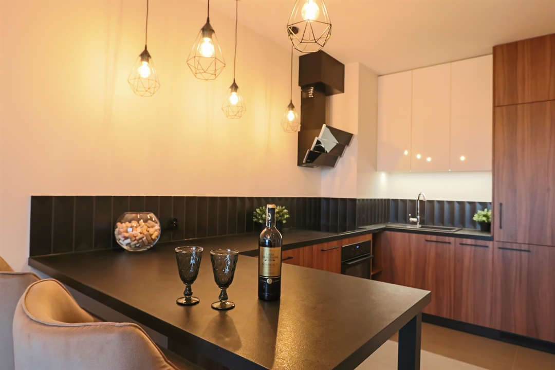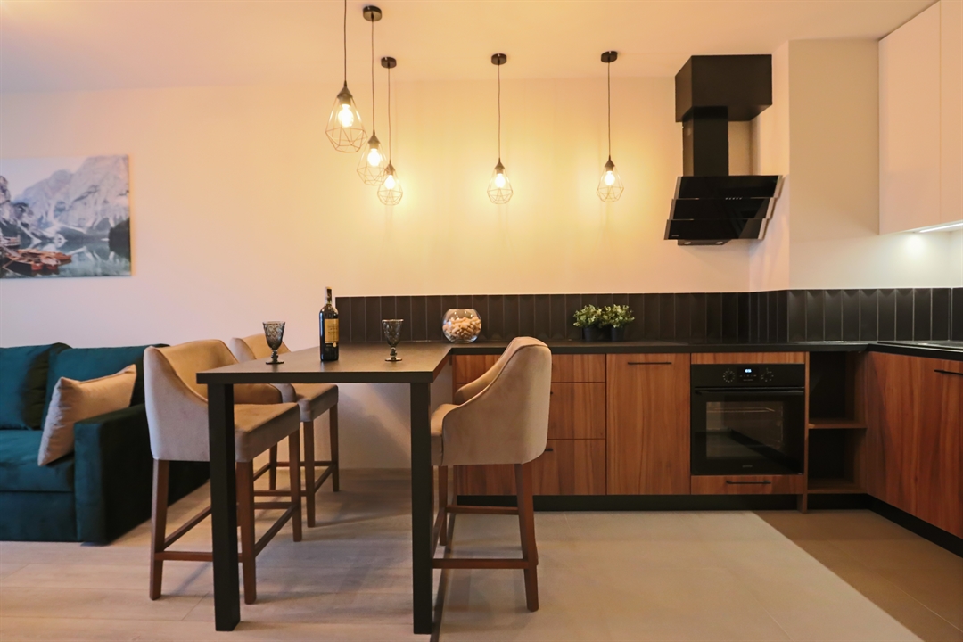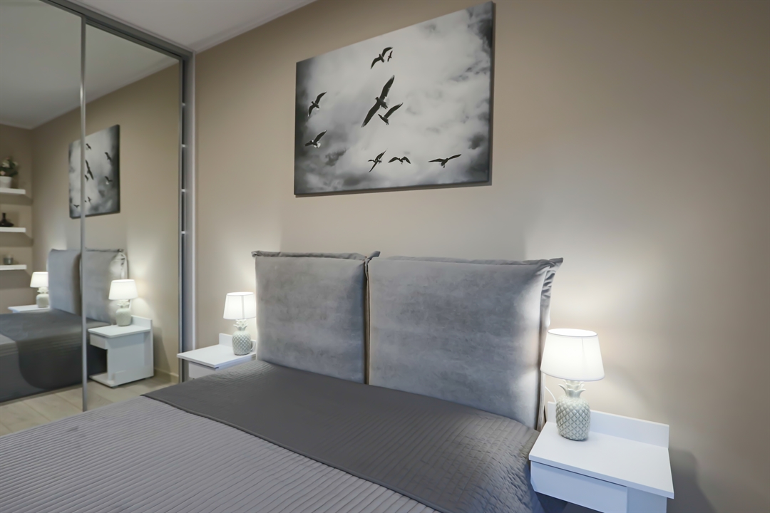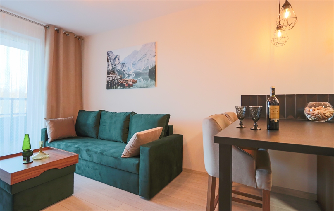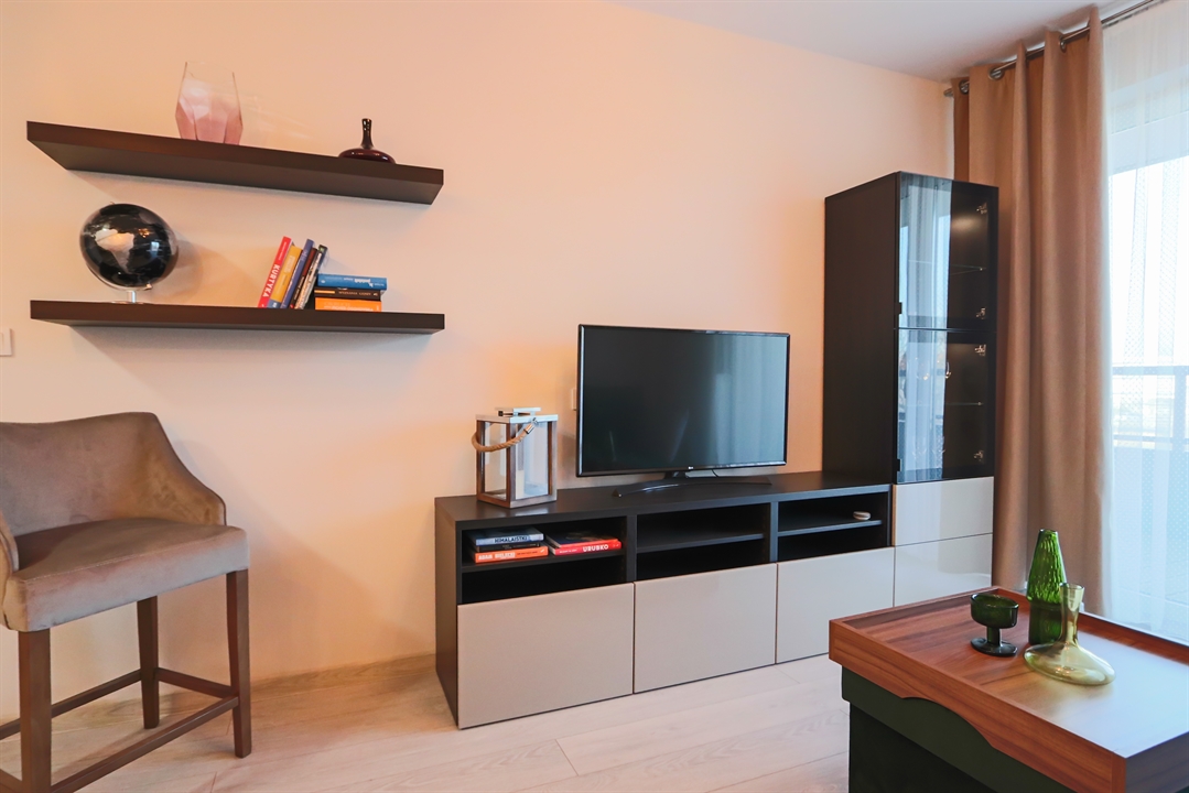 W pełni umeblowane i urządzone mieszkanie o podwyższonym standardzie dla jednej lub dwóch osób. Jasne, praktycznie urządzone o maksymalnie wykorzystanej powierzchni. Składa się z pokoju dziennego połączonego z kuchnią, sypialni, łazienki i korytarza. Pokój dzienny charakteryzuje się dużą powierzchnią okien dzięki podwójnym drzwiom balkonowym prowadzącym na przestronny taras o powierzchni 10 m2. Na taras można też wyjść bezpośrednio z sypialni. Nowocześnie urządzone mieszkanie z dużą ilością nastrojowego oświetlenia. W pełni wyposażona kuchnia w urządzenia dużego AGD. W salonie i sypialni znajdują się telewizory LCD 43 cale.