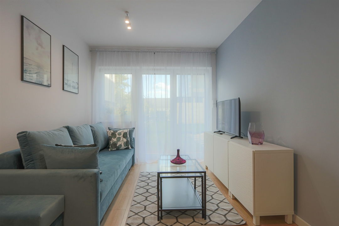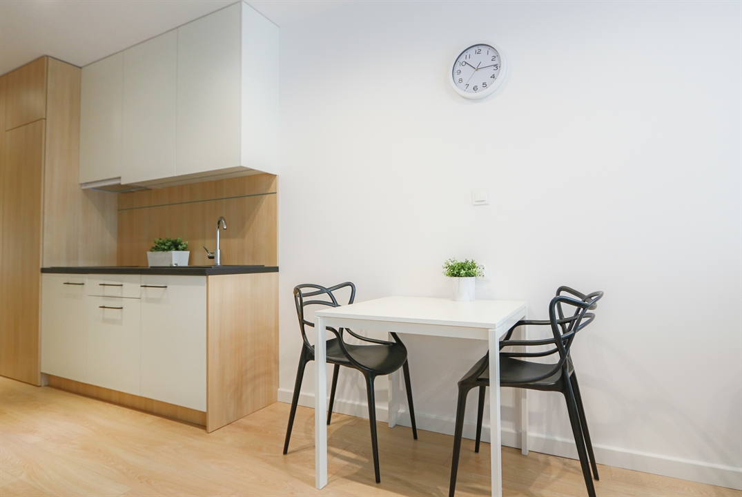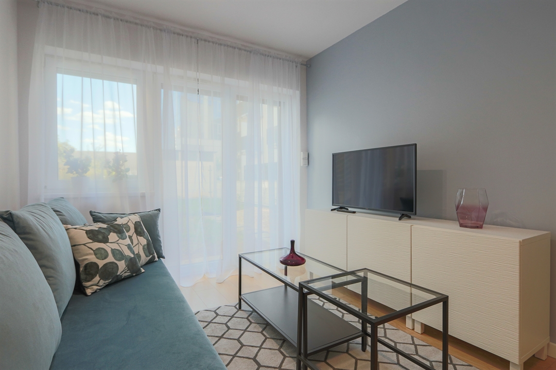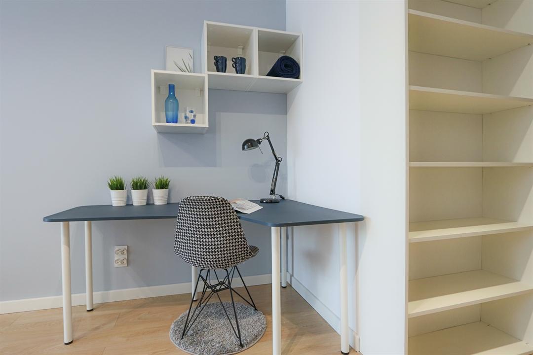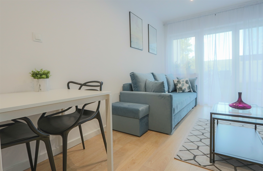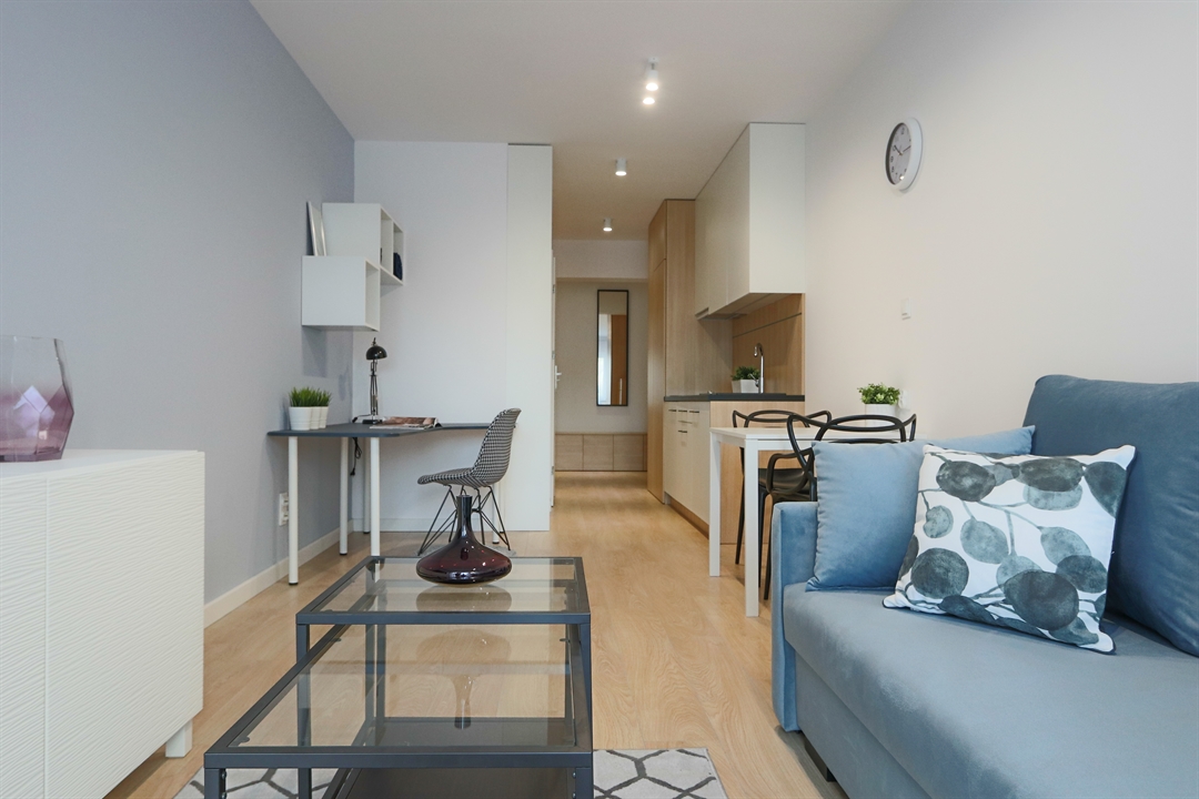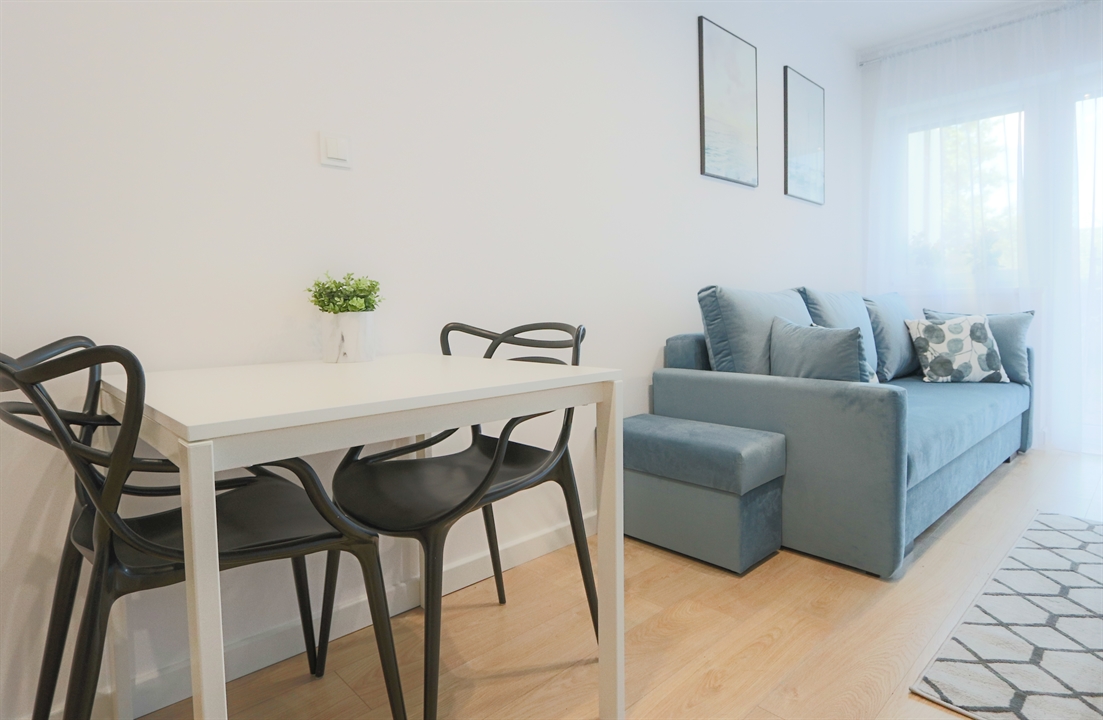 Komfortowa kawalerka z osobna garderobą. Przestrzeń 30 mkw została maksymalnie wykorzystana zapewniając wygodę najemcy. Jasny pokój wyposażony jest w dużą rozkładaną kanapę z powierzchnia spania aż 140x200 cm, komodę z miejscem do przechowywania, stół jadalniany, oraz duże biurko do pracy lub nauki.