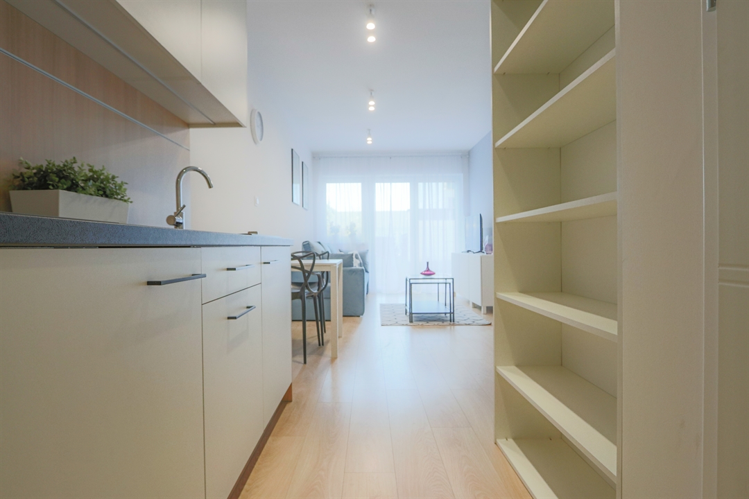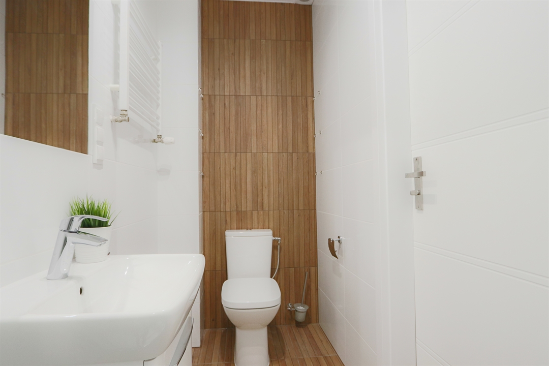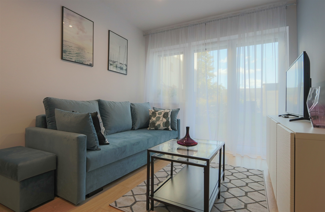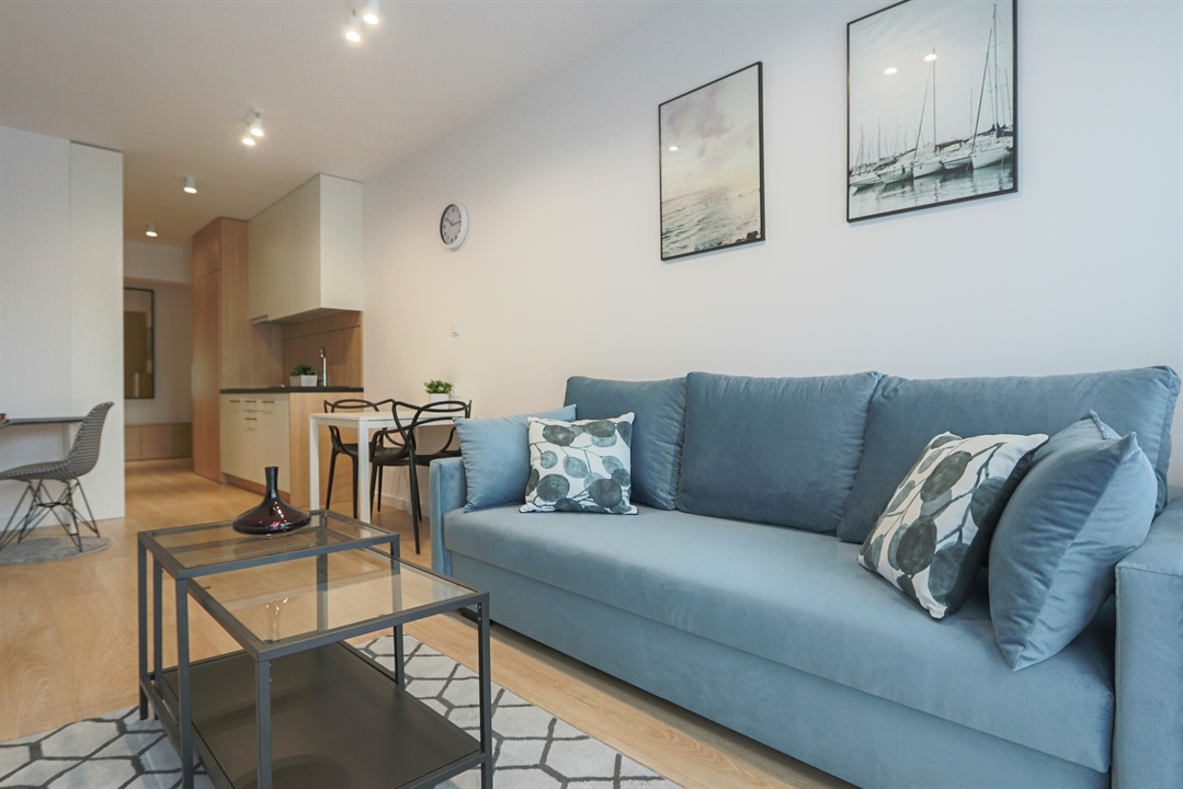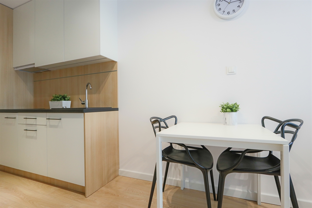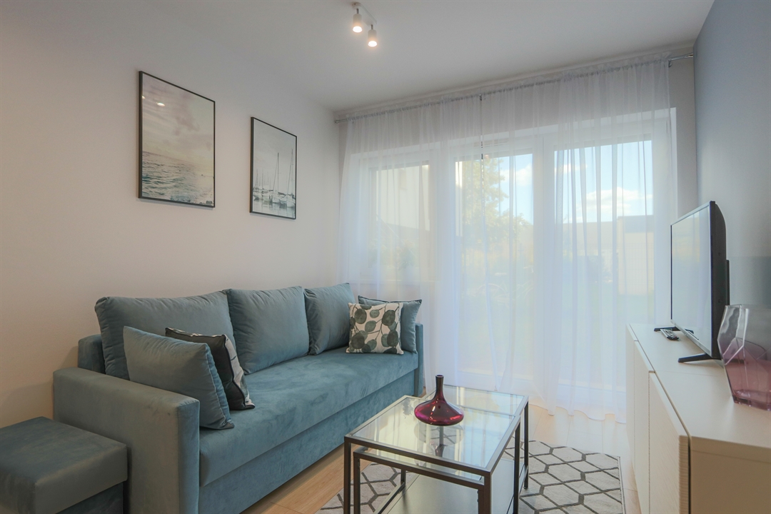Komfortowa kawalerka z osobna garderobą. Przestrzeń 30 mkw została maksymalnie wykorzystana zapewniając wygodę najemcy. Jasny pokój wyposażony jest w dużą rozkładaną kanapę z powierzchnia spania aż 140x200 cm, komodę z miejscem do przechowywania, stół jadalniany, oraz duże biurko do pracy lub nauki.
