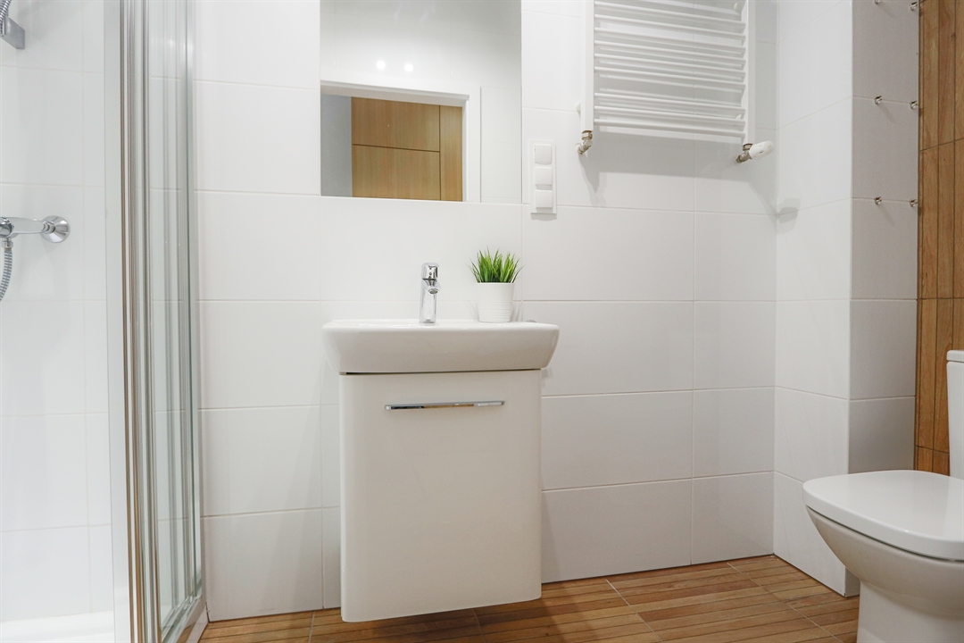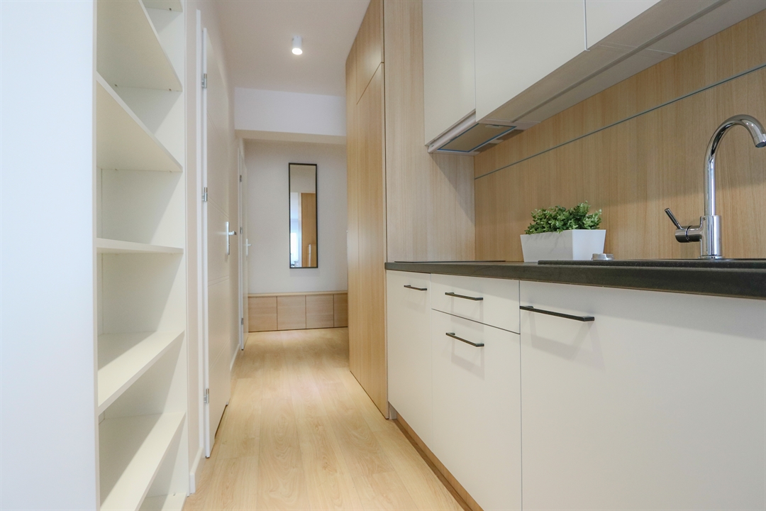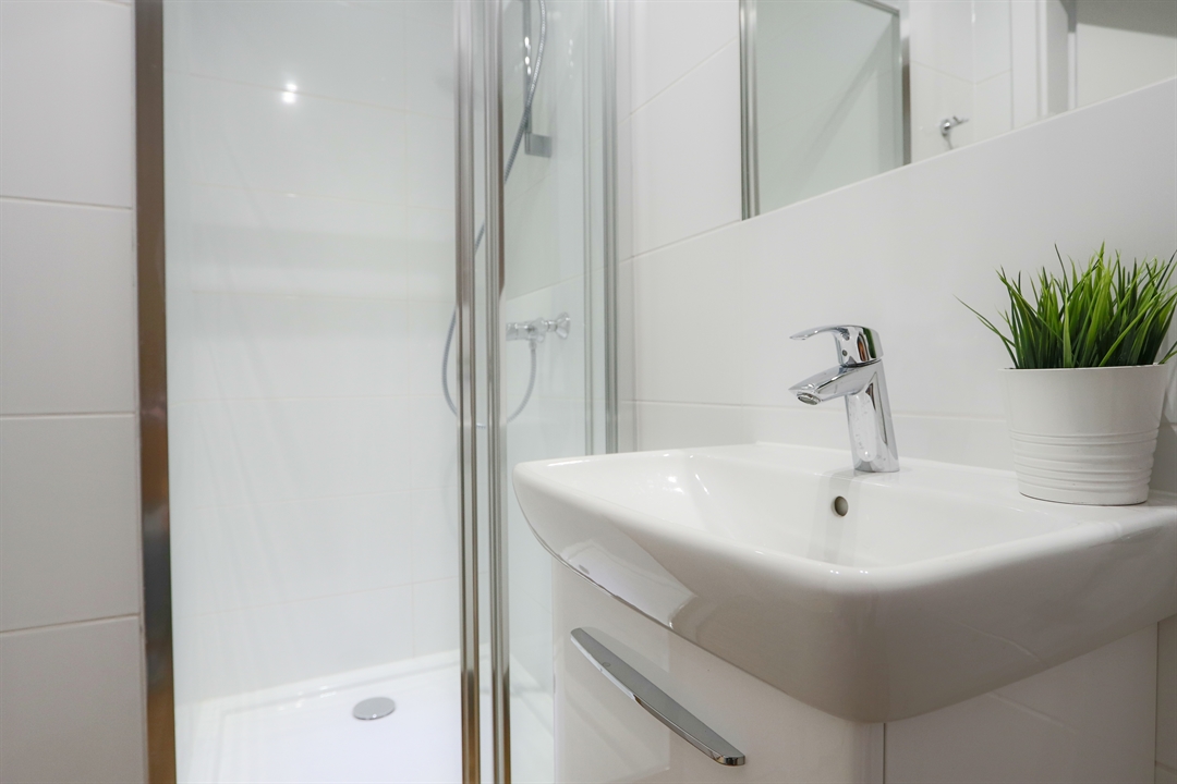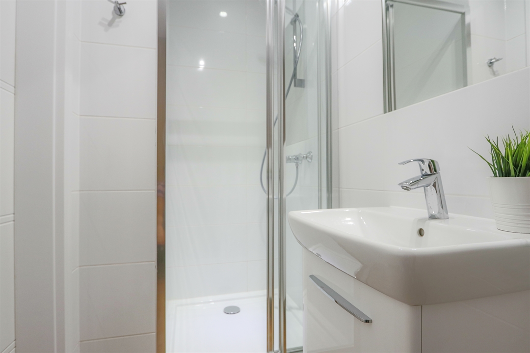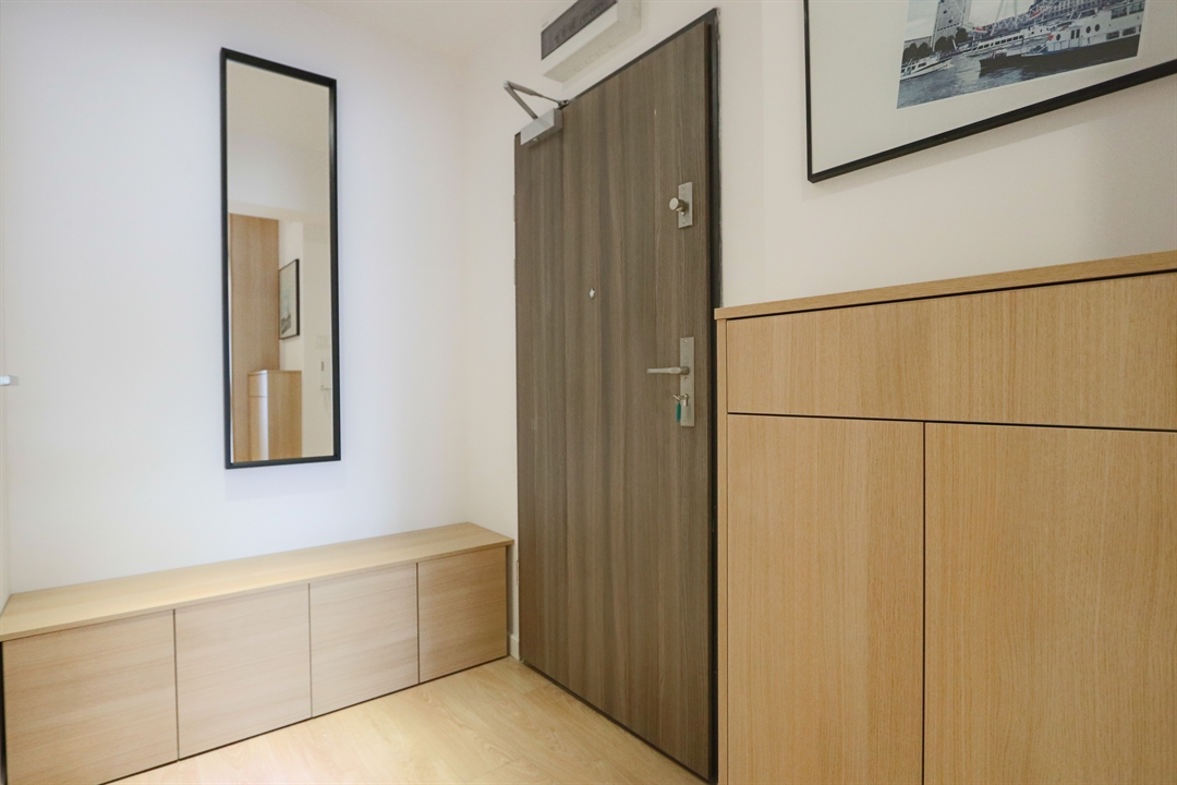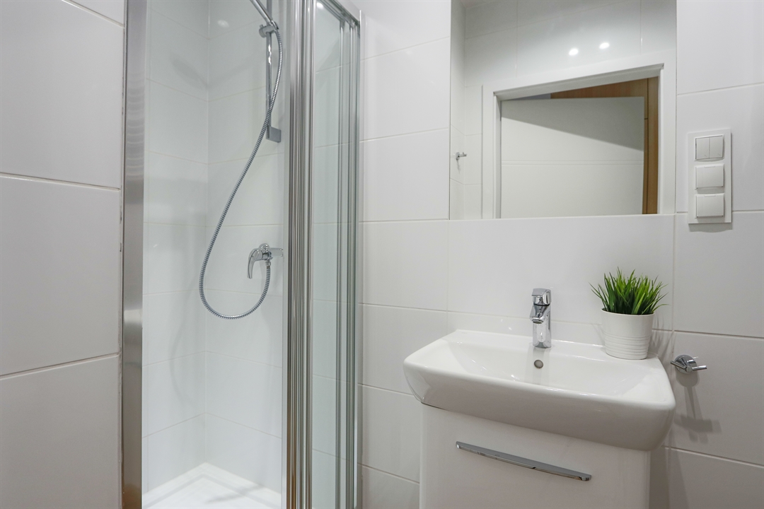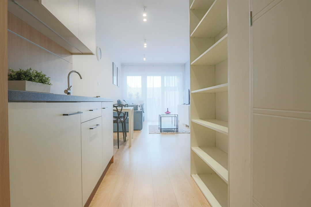 Komfortowa kawalerka z osobna garderobą. Przestrzeń 30 mkw została maksymalnie wykorzystana zapewniając wygodę najemcy. Jasny pokój wyposażony jest w dużą rozkładaną kanapę z powierzchnia spania aż 140x200 cm, komodę z miejscem do przechowywania, stół jadalniany, oraz duże biurko do pracy lub nauki.