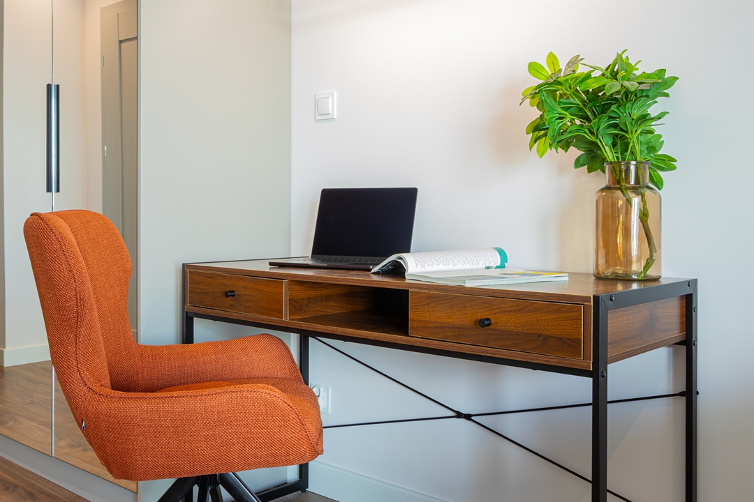 Pokój dzienny z rozkładaną sofą oraz miejscem do pracy i nauki