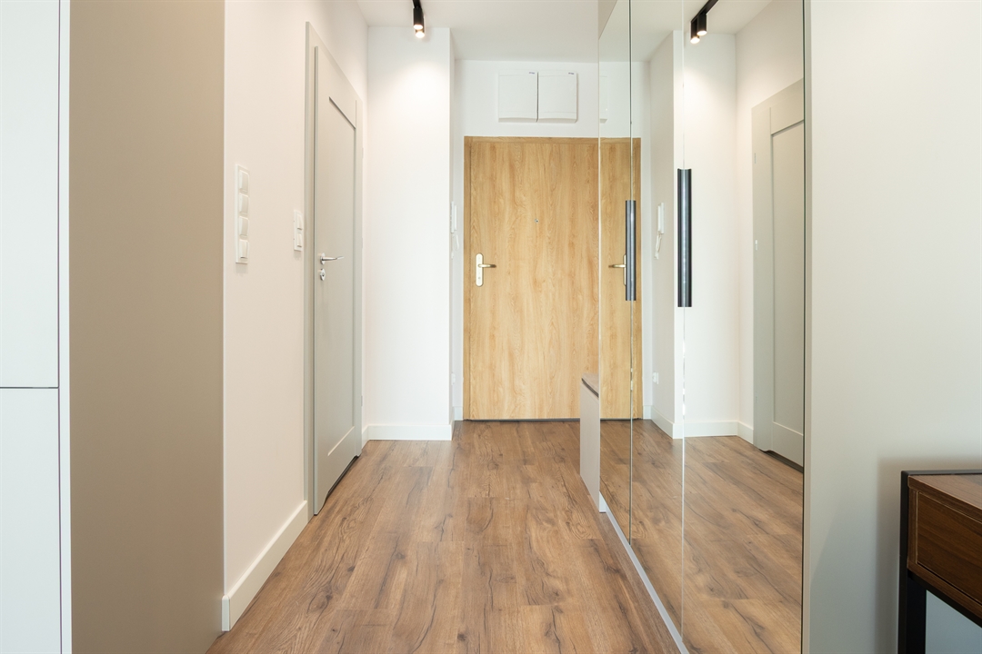 Korytarz z dużą szafą garderobianą w zabudowie meblowej
