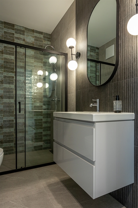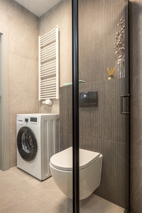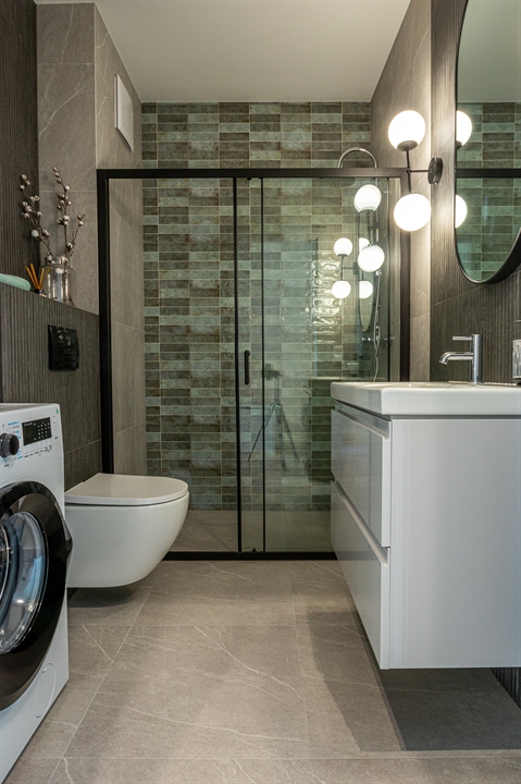 Łazienka wyposażona jest w dużą kabinę prysznicową oraz pralkę