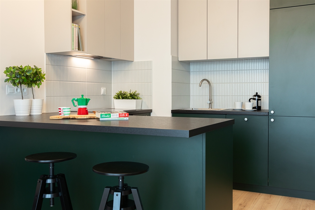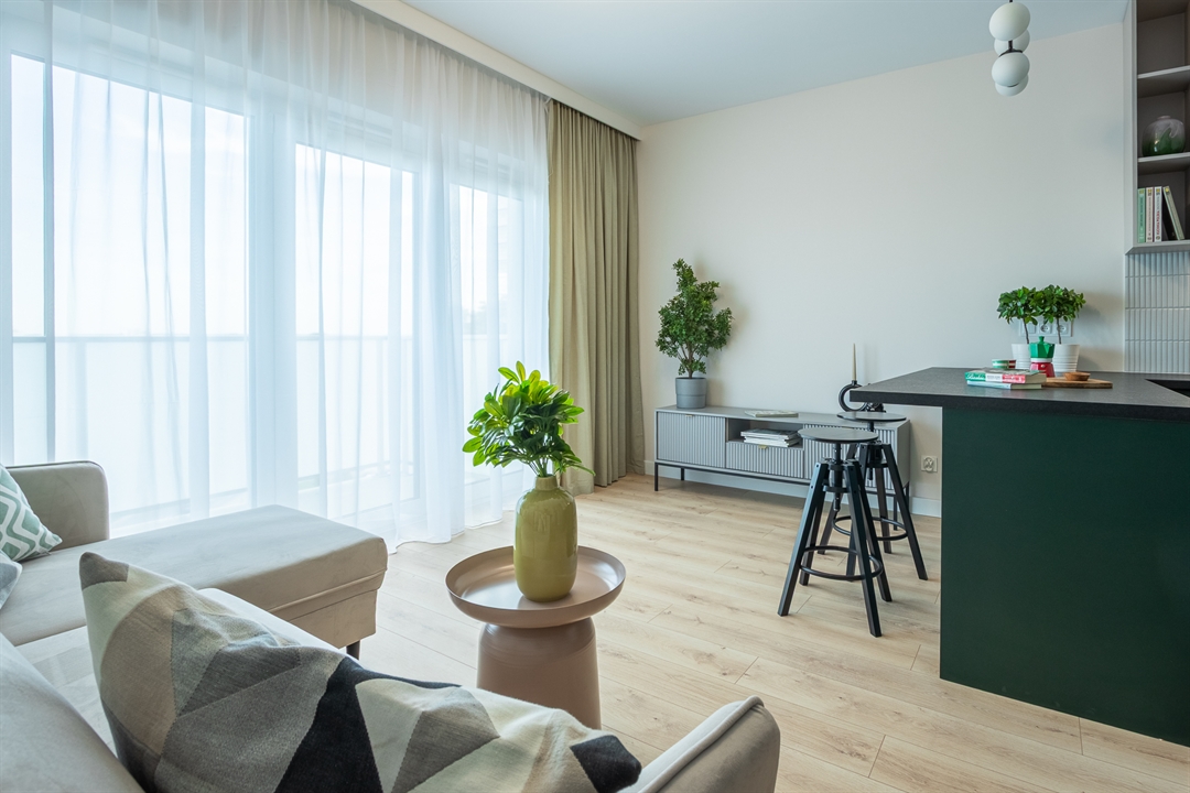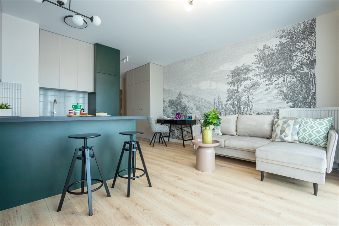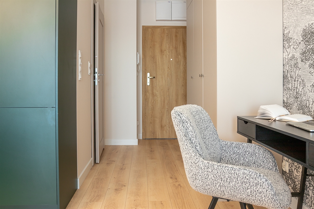 Mieszkanie o powierzchni 30 metrów kwadratowych zlokalizowane jest na ul. Hawelańskiej w Poznaniu (dzielnica Winogrady) i składa się z salonu z aneksem kuchennym, korytarza i łazienki. Wszystkie pomieszczenia są w pełni wyposażone