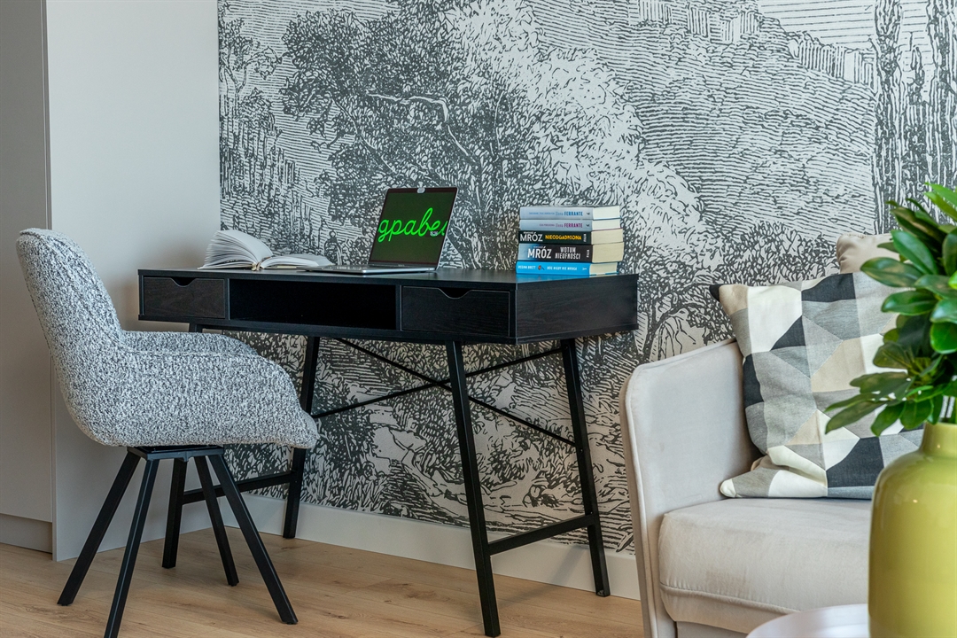 Pokój dzienny z rozkładaną sofą oraz miejscem do pracy i nauki
