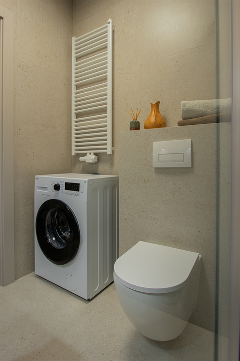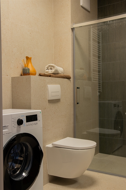 Łazienka wyposażona jest w dużą kabinę prysznicową oraz pralkę