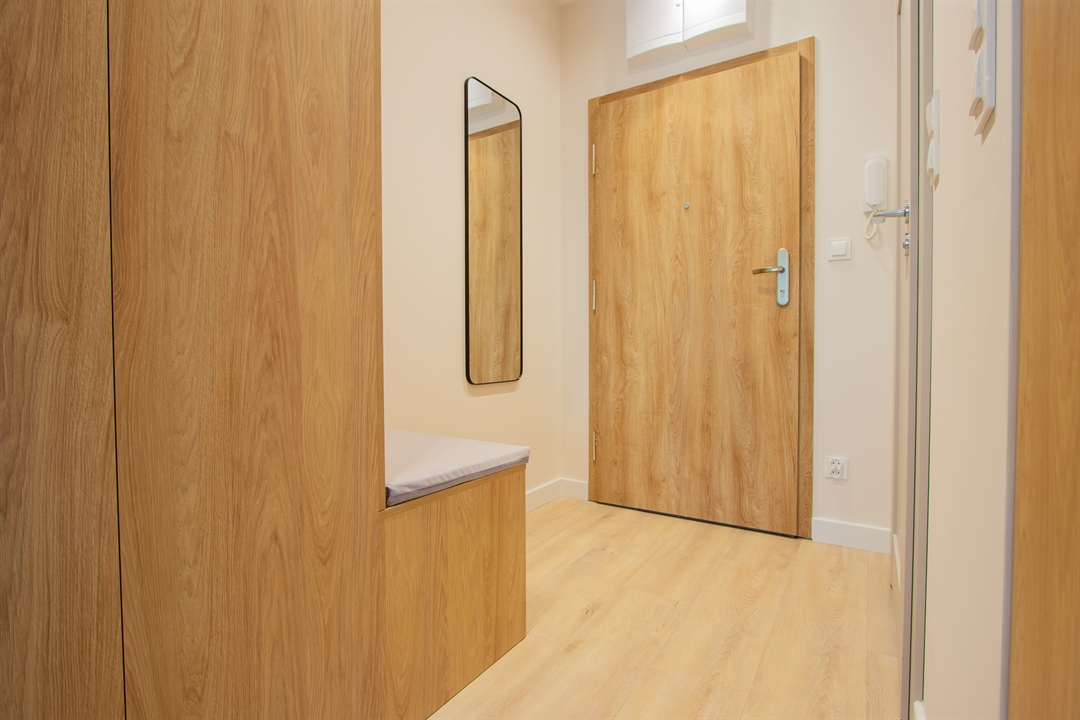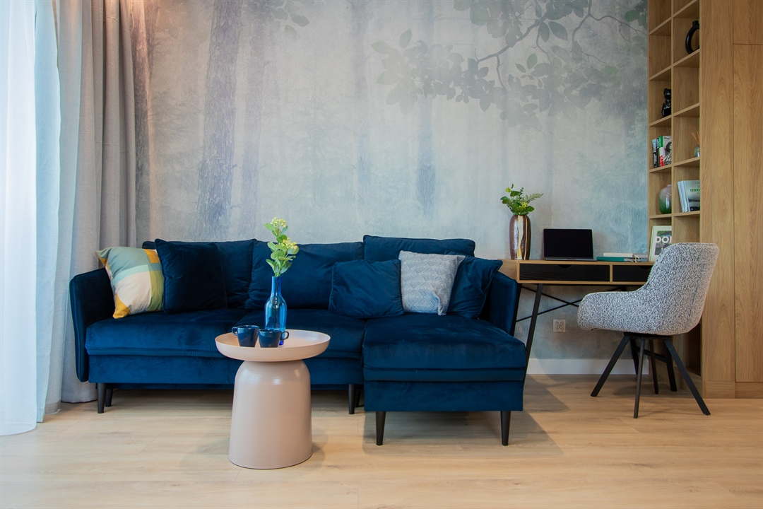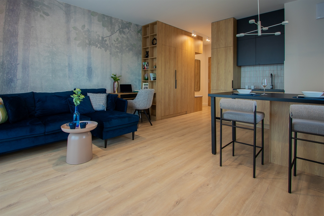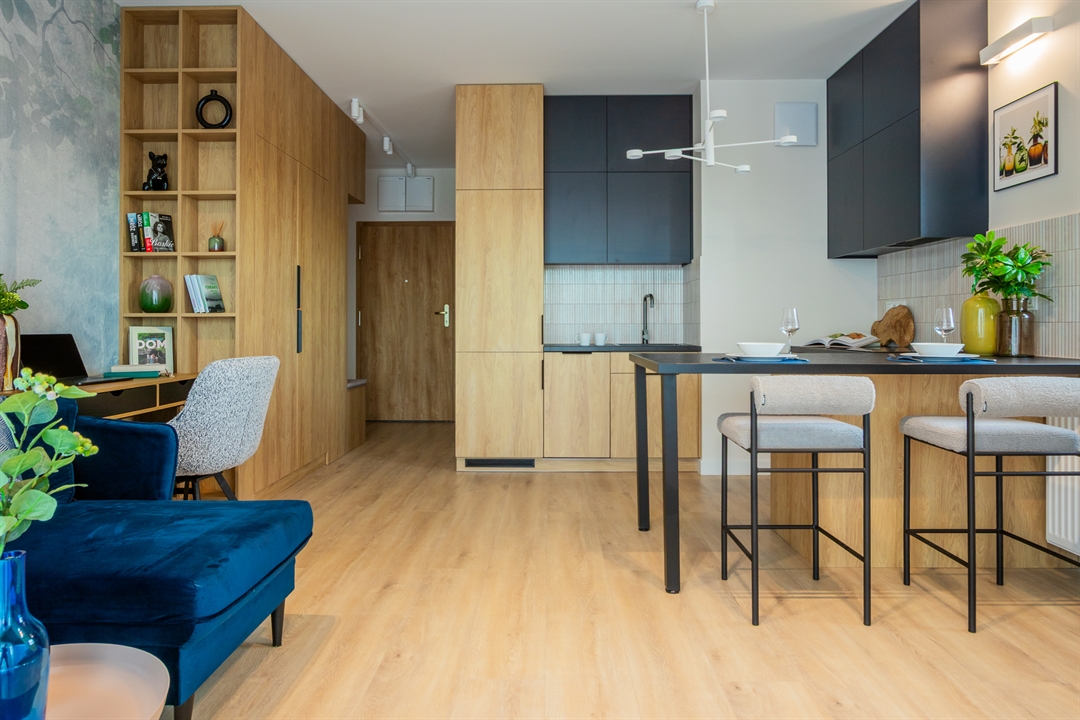 Mieszkanie o powierzchni 30 metrów kwadratowych zlokalizowane jest na ul. Hawelańskiej w Poznaniu (dzielnica Winogrady) i składa się z salonu z aneksem kuchennym, korytarza i łazienki. Wszystkie pomieszczenia są w pełni wyposażone