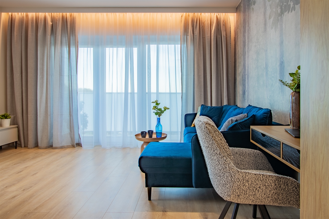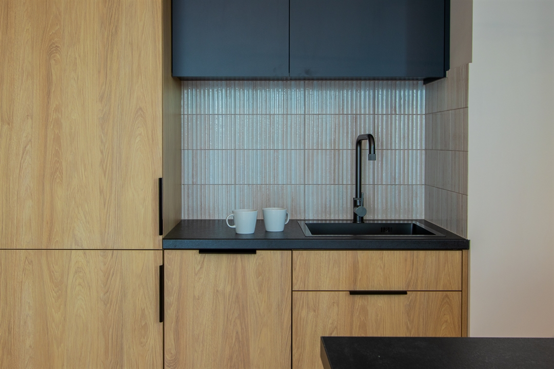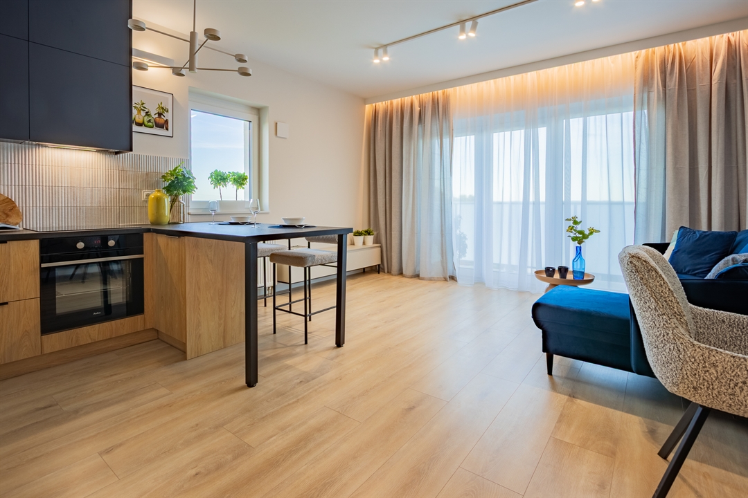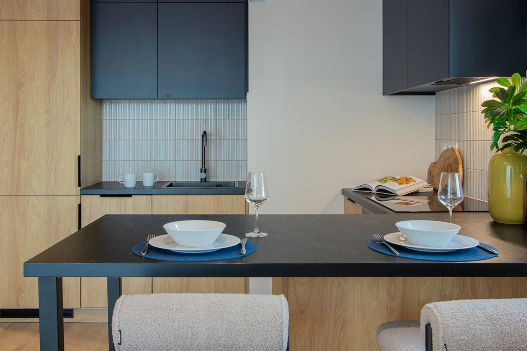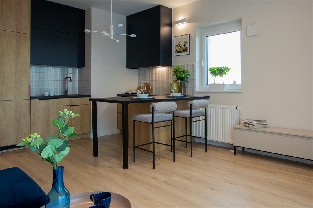 Mieszkanie o powierzchni 30 metrów kwadratowych zlokalizowane jest na ul. Hawelańskiej w Poznaniu (dzielnica Winogrady) i składa się z salonu z aneksem kuchennym, korytarza i łazienki. Wszystkie pomieszczenia są w pełni wyposażone