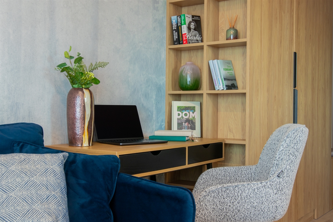 Pokój dzienny z rozkładaną sofą oraz miejscem do pracy i nauki