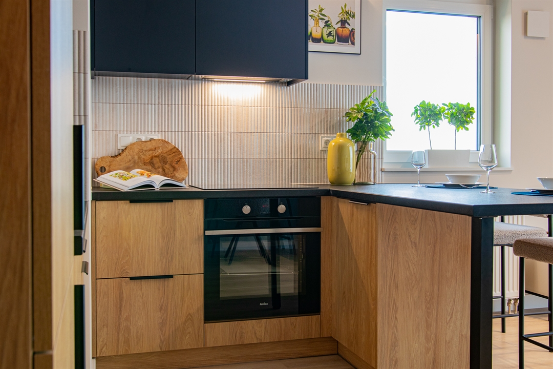 Aneks kuchenny z kompletem sprzętów AGD (piekarnik, płyta grzewcza , zmywarka, lodówka w zabudowie) i stołem jadalnianym;