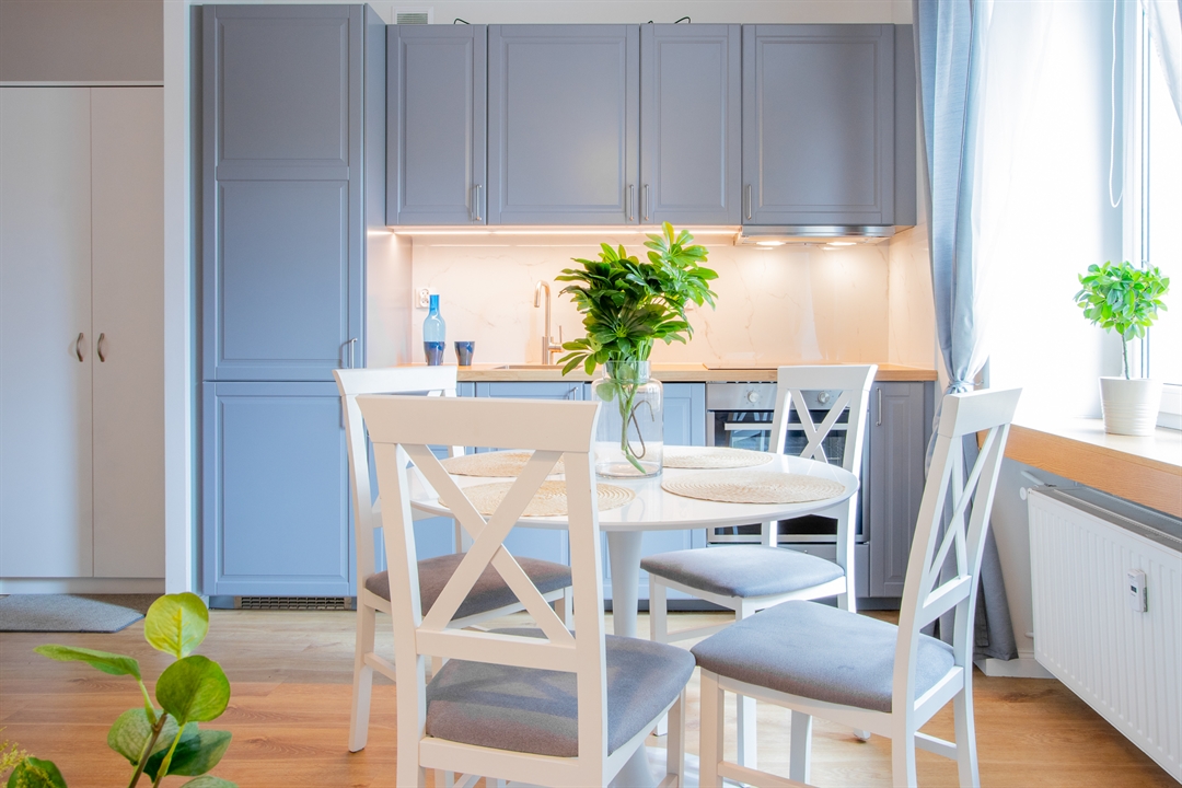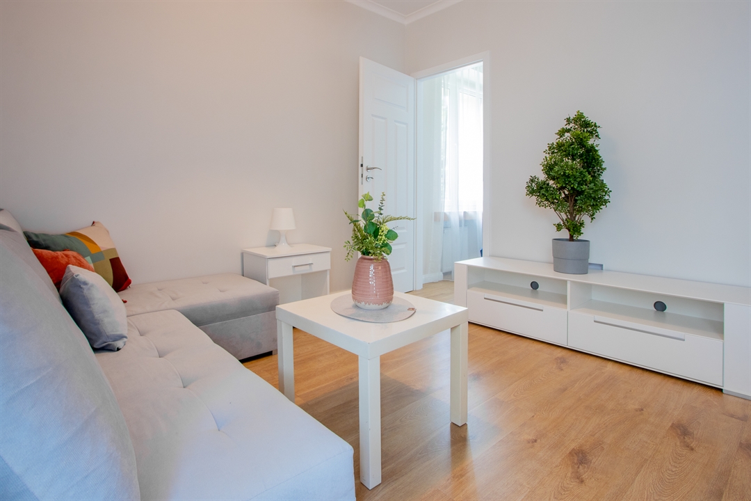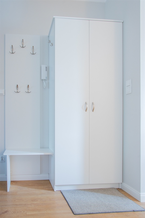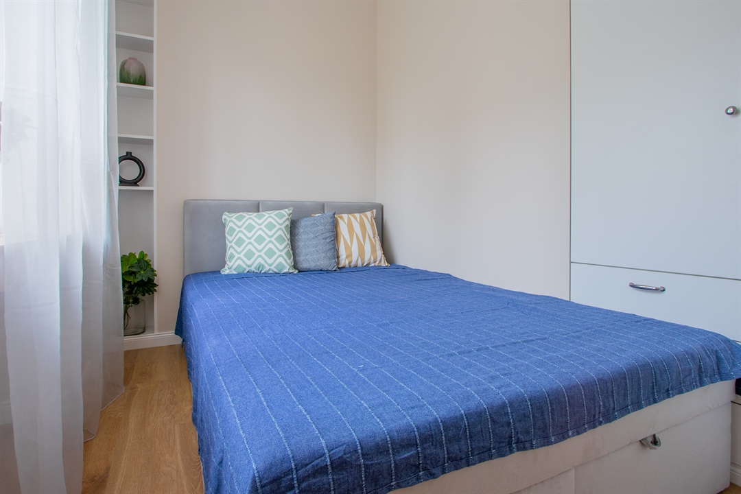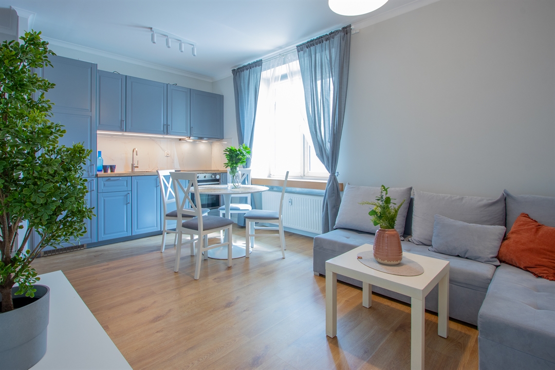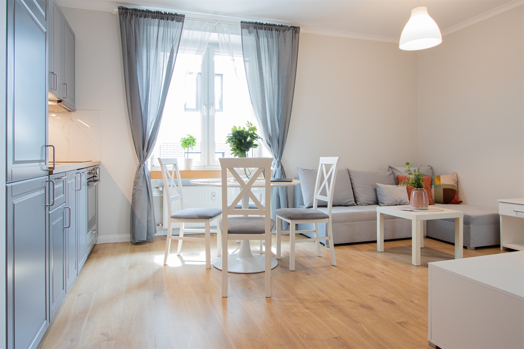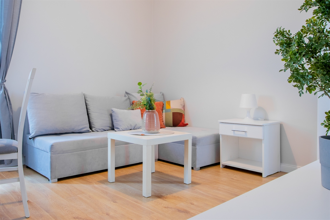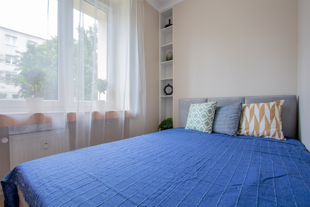 Do dyspozycji lokatorów są trzy pojemne szafy garderobiane, stół jadalniany z kompletem krzeseł, rozkładana sofa w salonie z dużą powierzchnią spania (140 × 200 cm) oraz podwójne łóżko w sypialni.