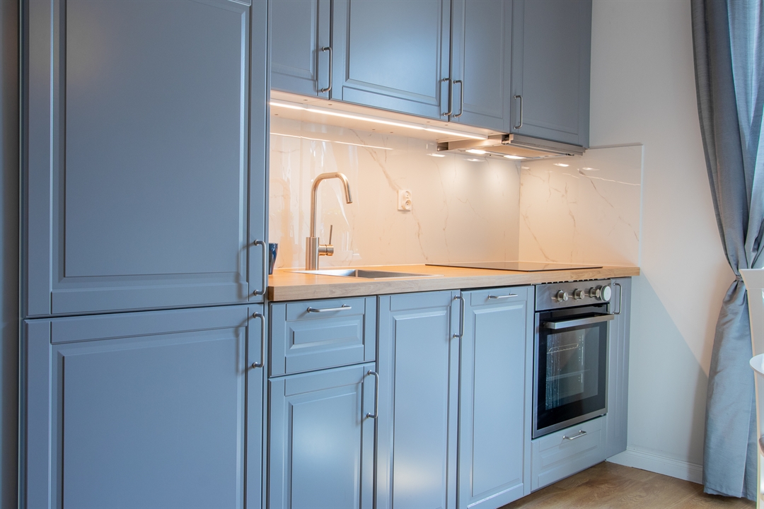 Kuchnia została wyposażona w zabudowę meblową wykonaną na zamówienie oraz komplet sprzętu AGD: lodówkę w zabudowie, zmywarkę, piekarnik i płytę grzewczą.