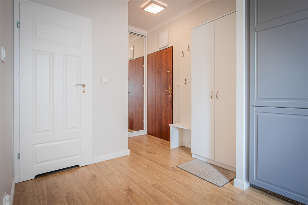 Dużym atutem mieszkania jest bardzo jasna i przytulna aranżacja wnętrza, która sprawia, że przestrzeń jest komfortowa do codziennego życia.