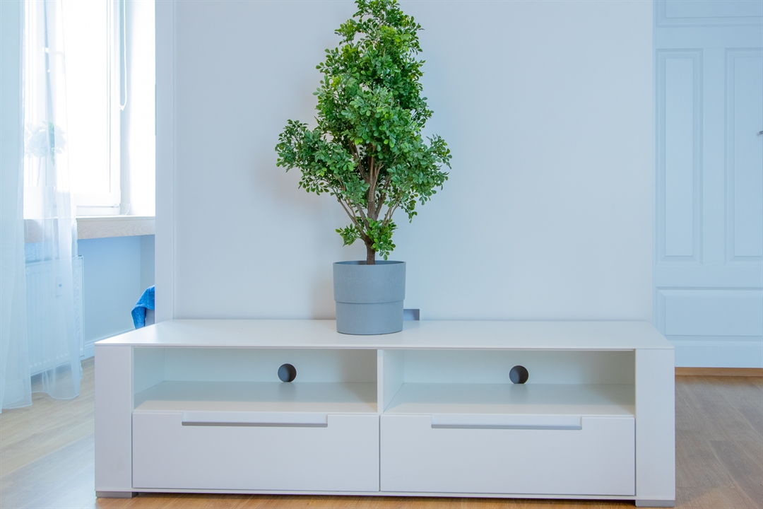 Przemyślany układ mieszkania pozwala maksymalnie wykorzystać dostępną przestrzeń, pozostawiając jednocześnie dużo swobody i komfortu – wnętrze nie jest przytłoczone nadmiarem mebli.