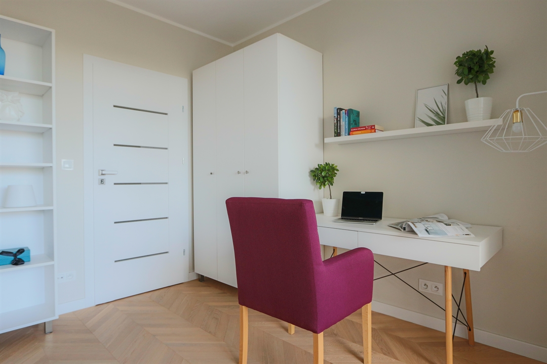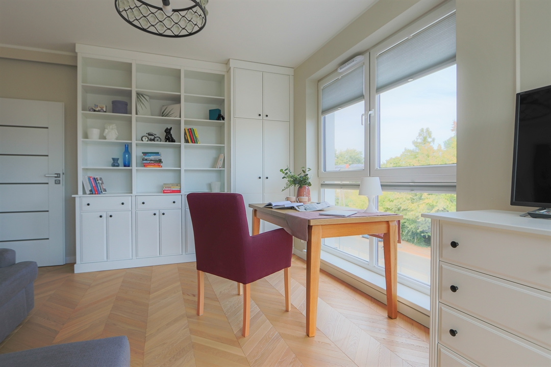 Sypialnia stanowi komfortową i funkcjonalną przestrzeń, wyposażoną w pojemną szafę, regał, sofę oraz biurko do pracy, co sprawia, że pomieszczenie doskonale sprawdzi się również jako gabinet lub pokój do pracy zdalnej.