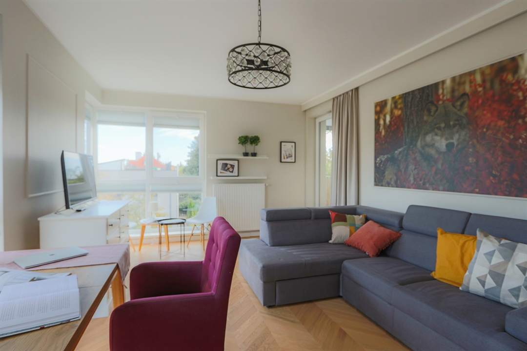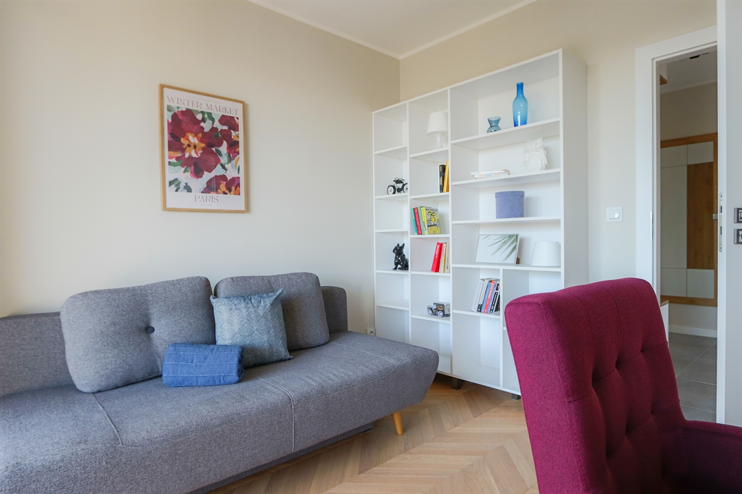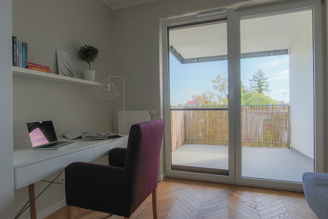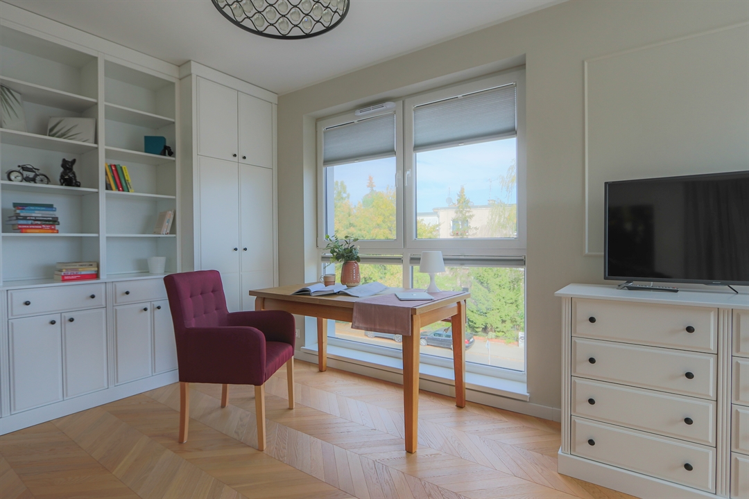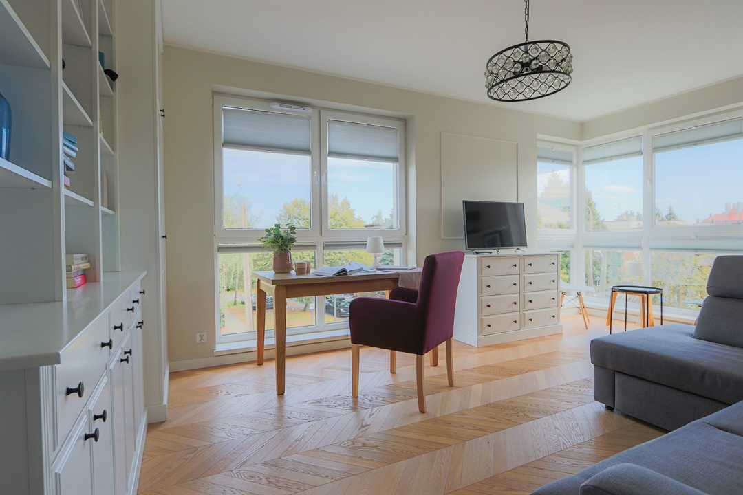 Centralnym punktem mieszkania jest przestronny salon z dużymi przeszkleniami, które zapewniają doskonałe doświetlenie wnętrza oraz otwierają przestrzeń na widok zieleni. W salonie znajdują się zabudowy z regałami, bardzo duża, rozkładana sofa narożnikowa oraz dodatkowe miejsce do pracy.