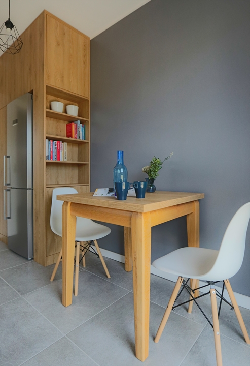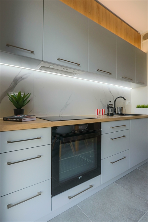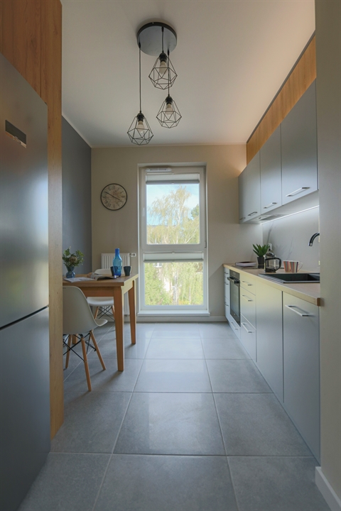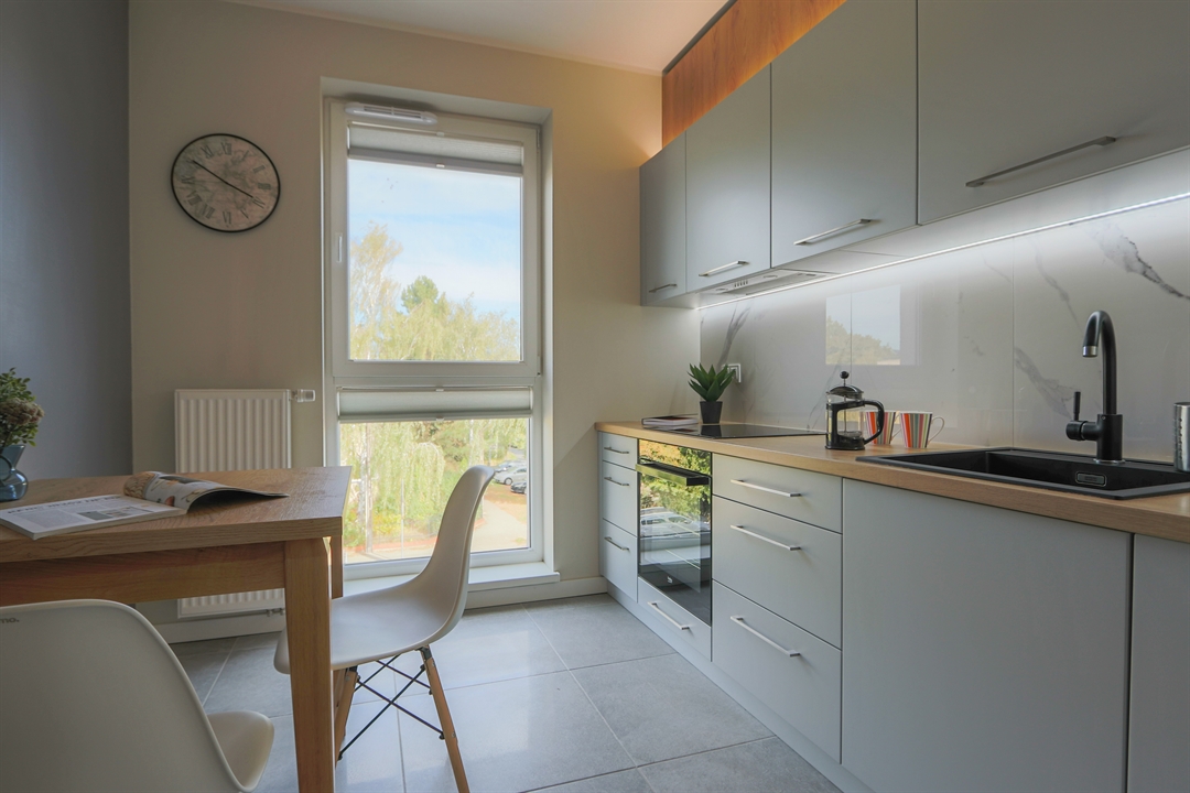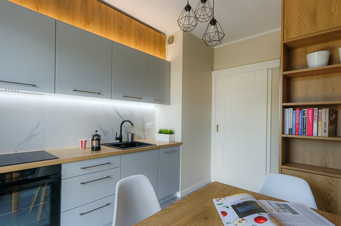Kuchnia została wykonana w nowoczesnej zabudowie i wyposażona w wysokiej jakości sprzęt AGD, w tym lodówkę, piekarnik, płytę indukcyjną oraz zmywarkę, co zapewnia wygodę codziennego użytkowania.