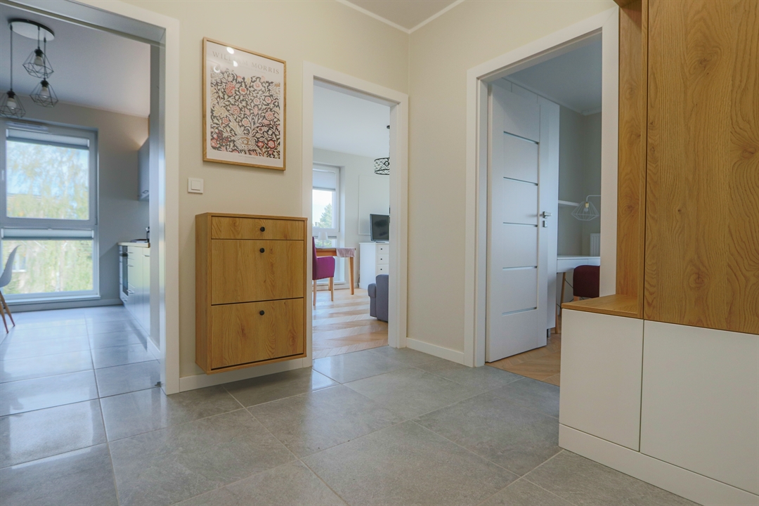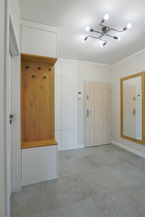 Przedpokój został zaprojektowany z myślą o wygodzie użytkowania i oferuje szafę garderobianą, siedzisko oraz praktyczne wieszaki.