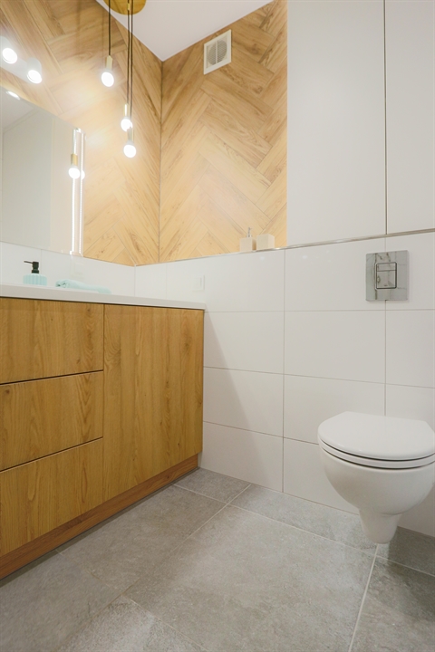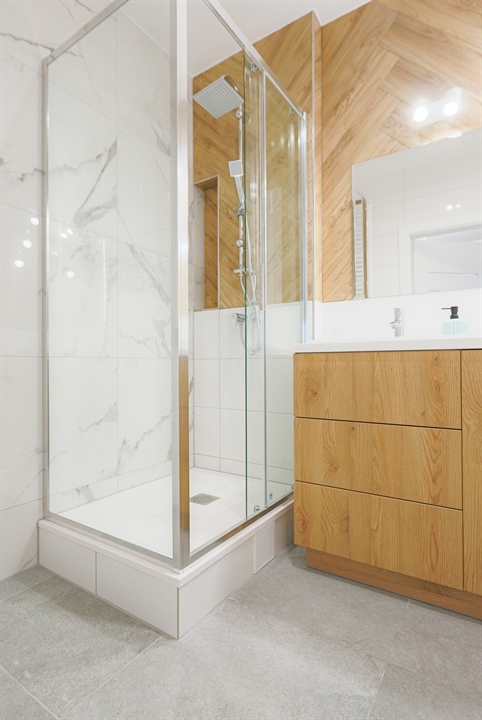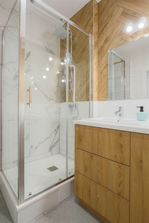 Łazienka utrzymana jest w nowoczesnym standardzie i wyposażona w kabinę prysznicową, zabudowę meblową oraz pralkę dyskretnie ukrytą w zabudowie.