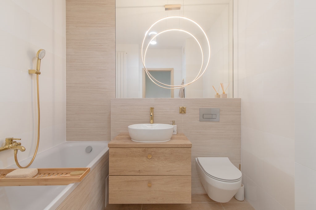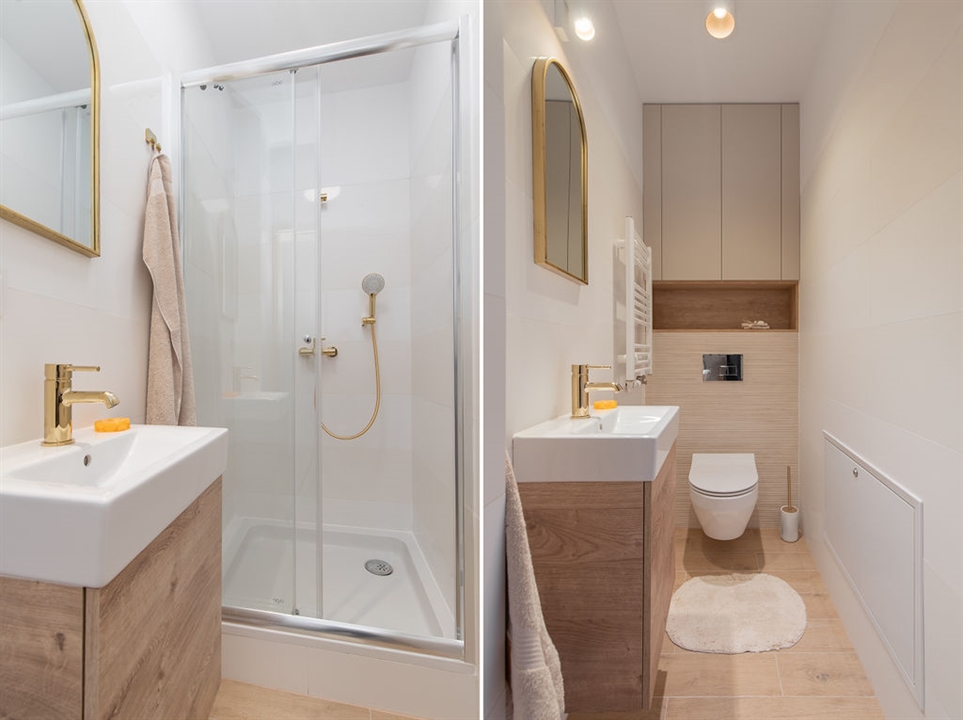 Do dyspozycji mieszkańców są dwie w pełni wykończone łazienki oraz dodatkowa toaleta, co znacząco podnosi komfort użytkowania domu.