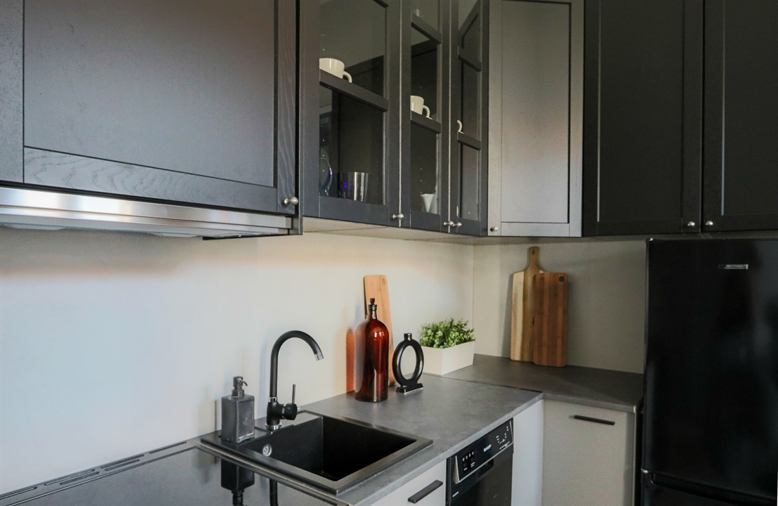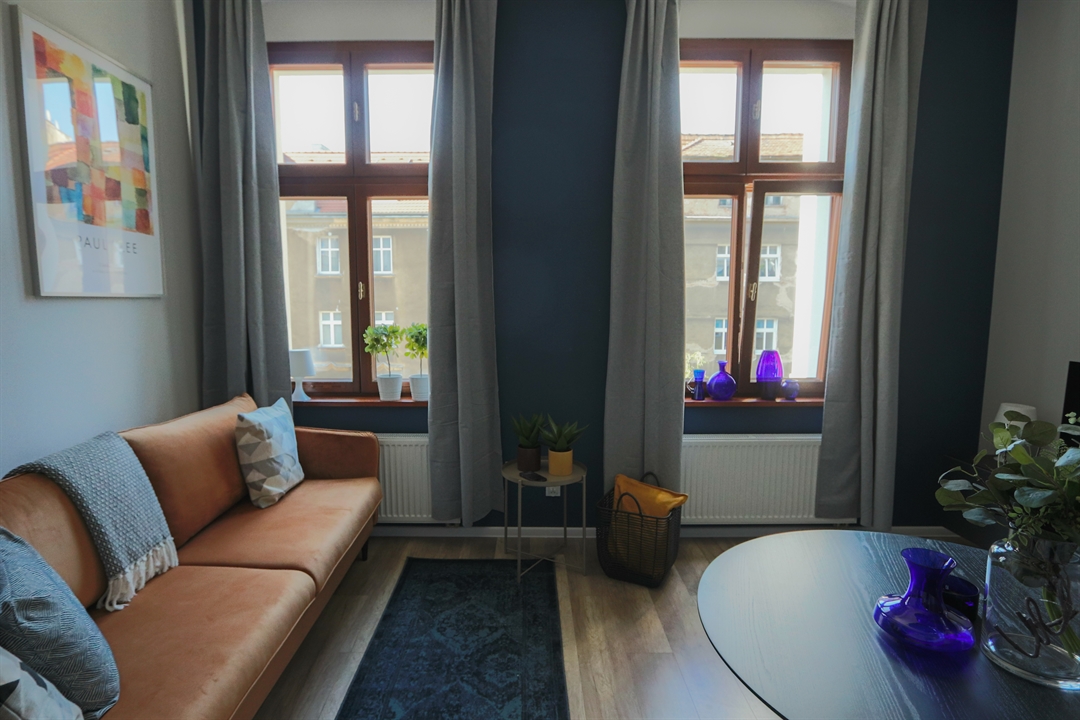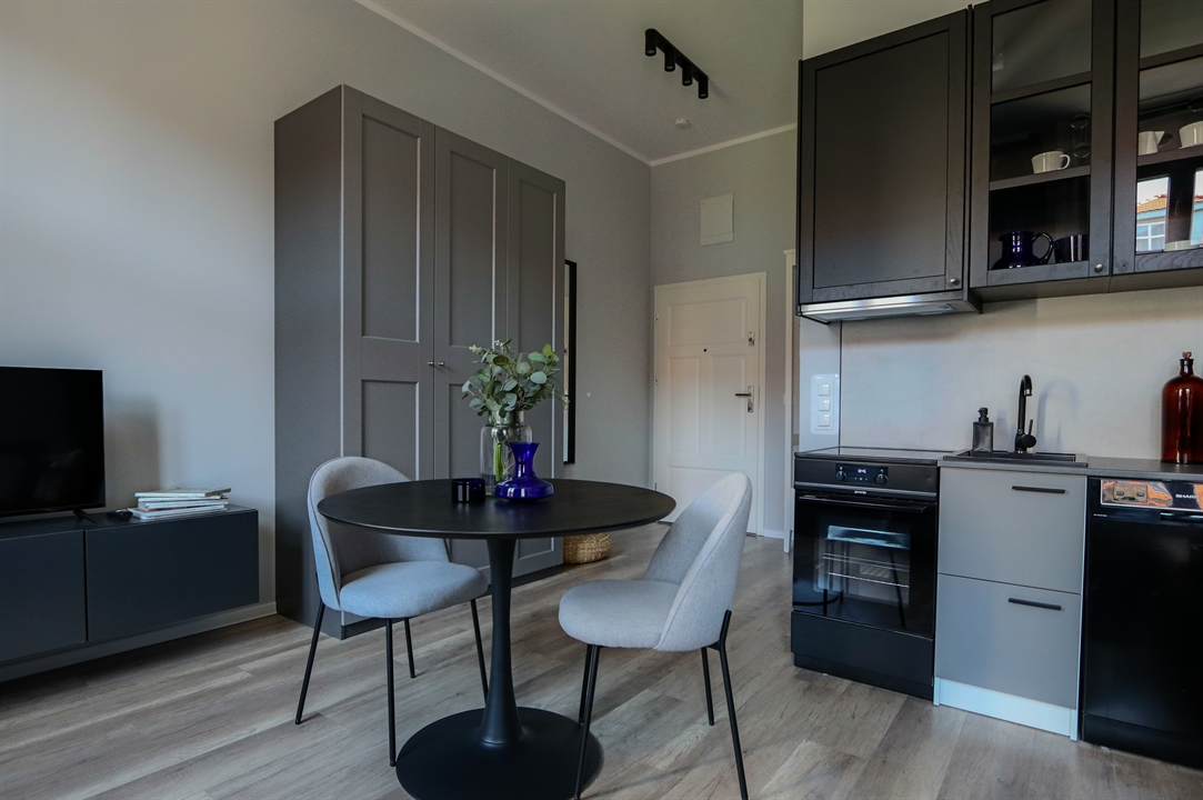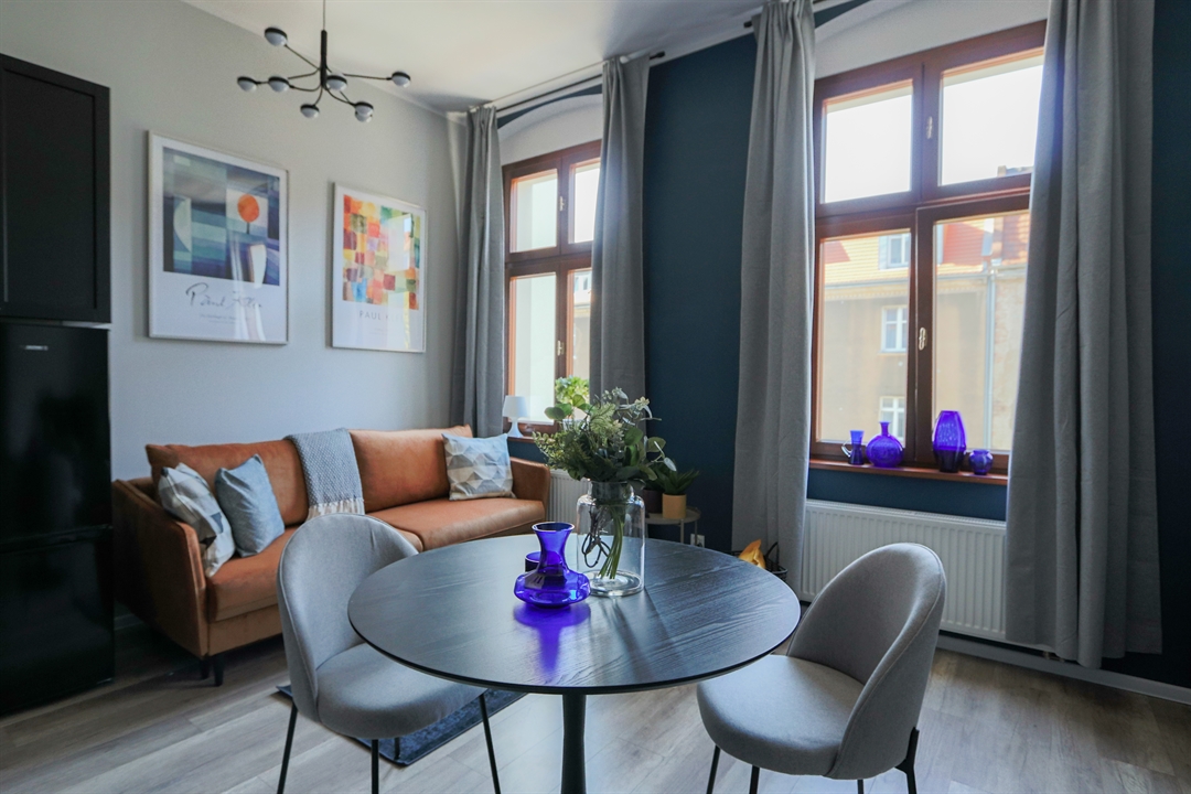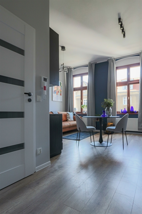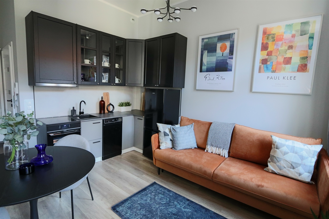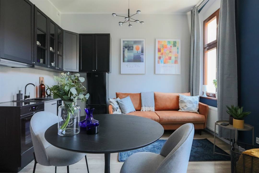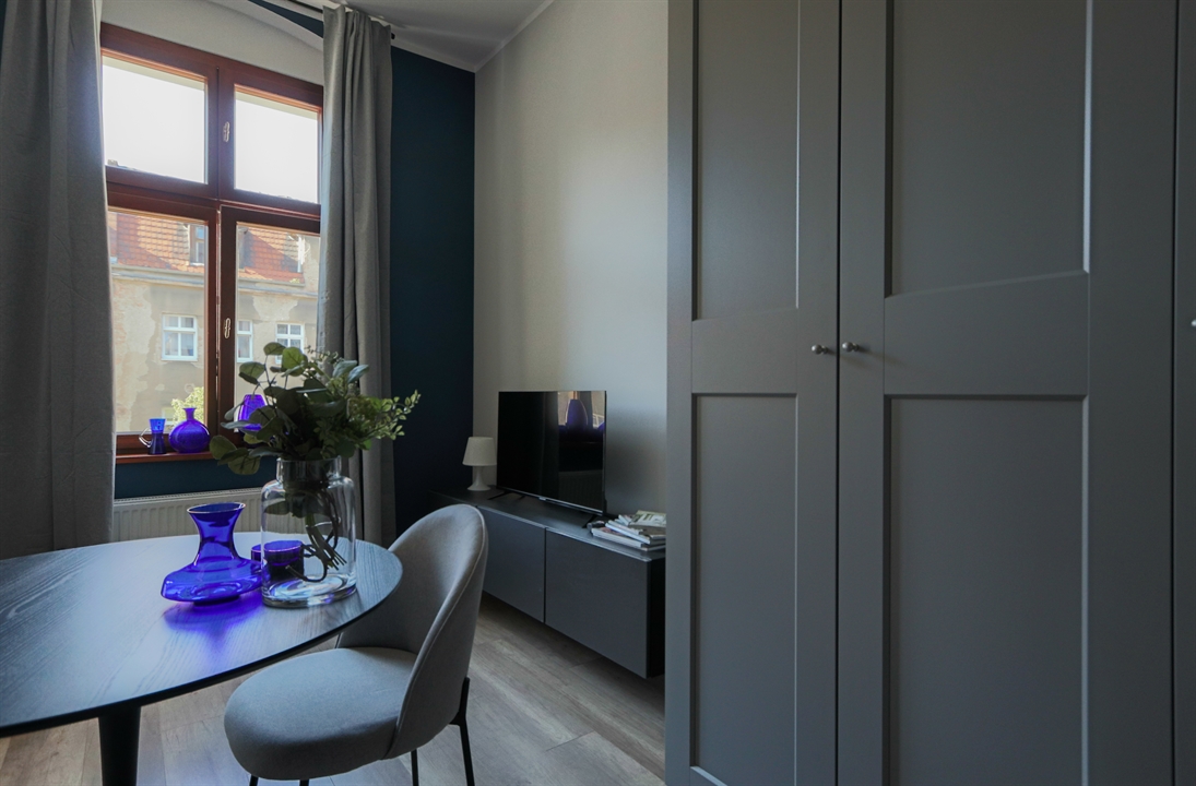 W części dziennej znajduje się rozkładana sofa z funkcją spania o powierzchni 140x200, stół jadalniany z krzesłami, telewizor z funkcją Smart TV oraz komoda RTV. Aneks kuchenny wyposażony jest w nowoczesną zabudowę wraz z lodówką, piekarnikiem, płytą grzewczą oraz zmywarką. Do dyspozycji najemcy pozostaje także duża i bardzo pojemna szafa garderobiana.