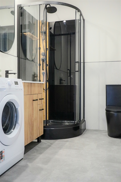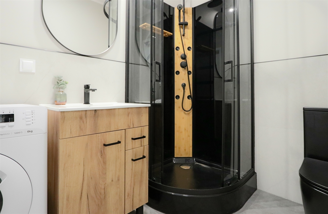 Łazienka została wykończona w wysokim standardzie i oferuje kabinę prysznicową z funkcją hydromasażu, duże lustro z oświetleniem oraz pralkę.