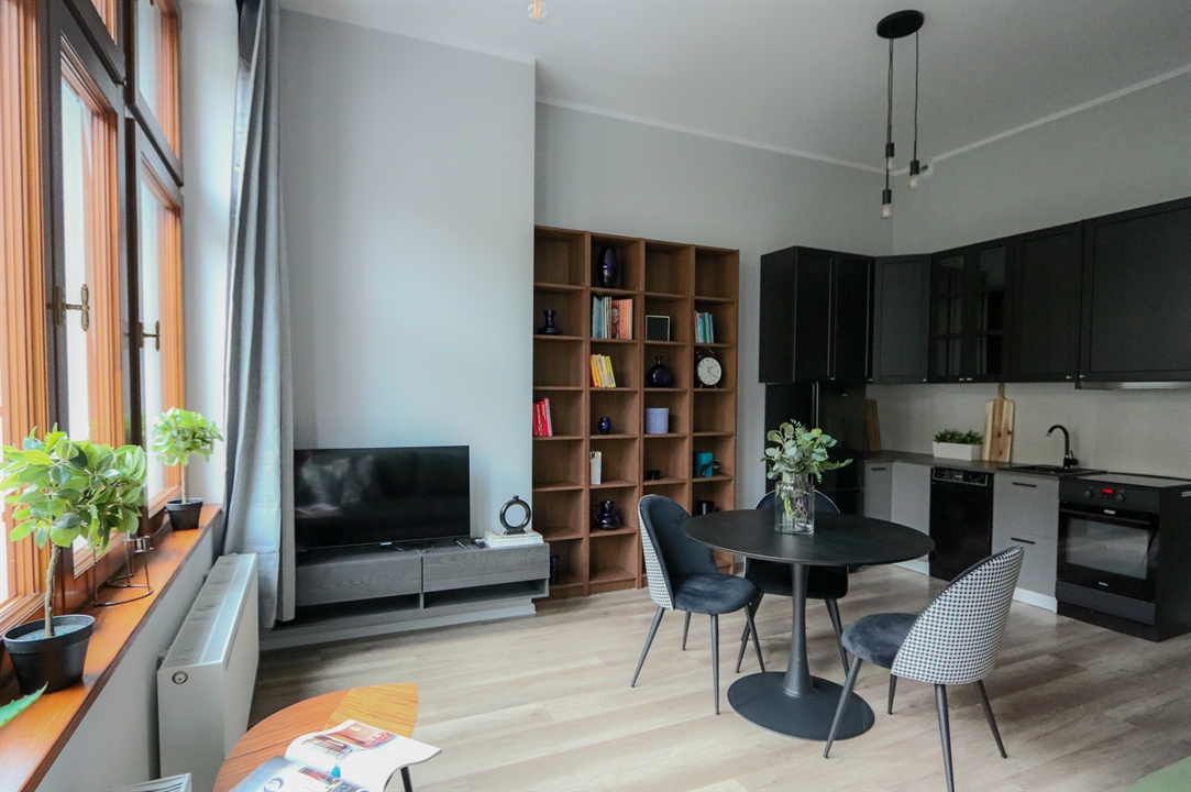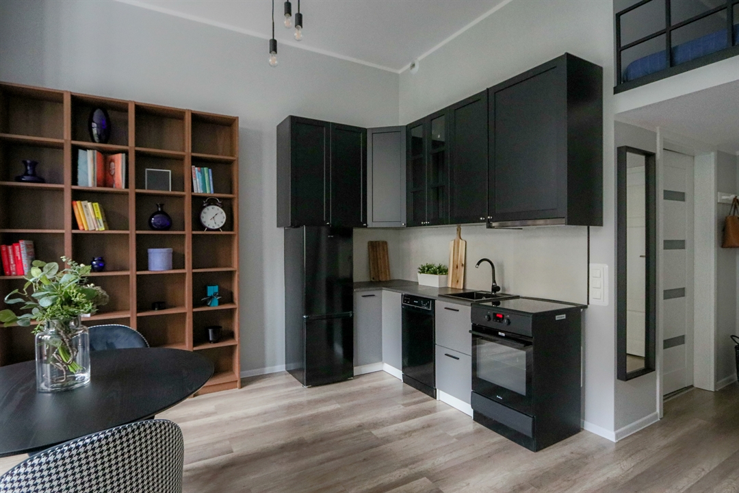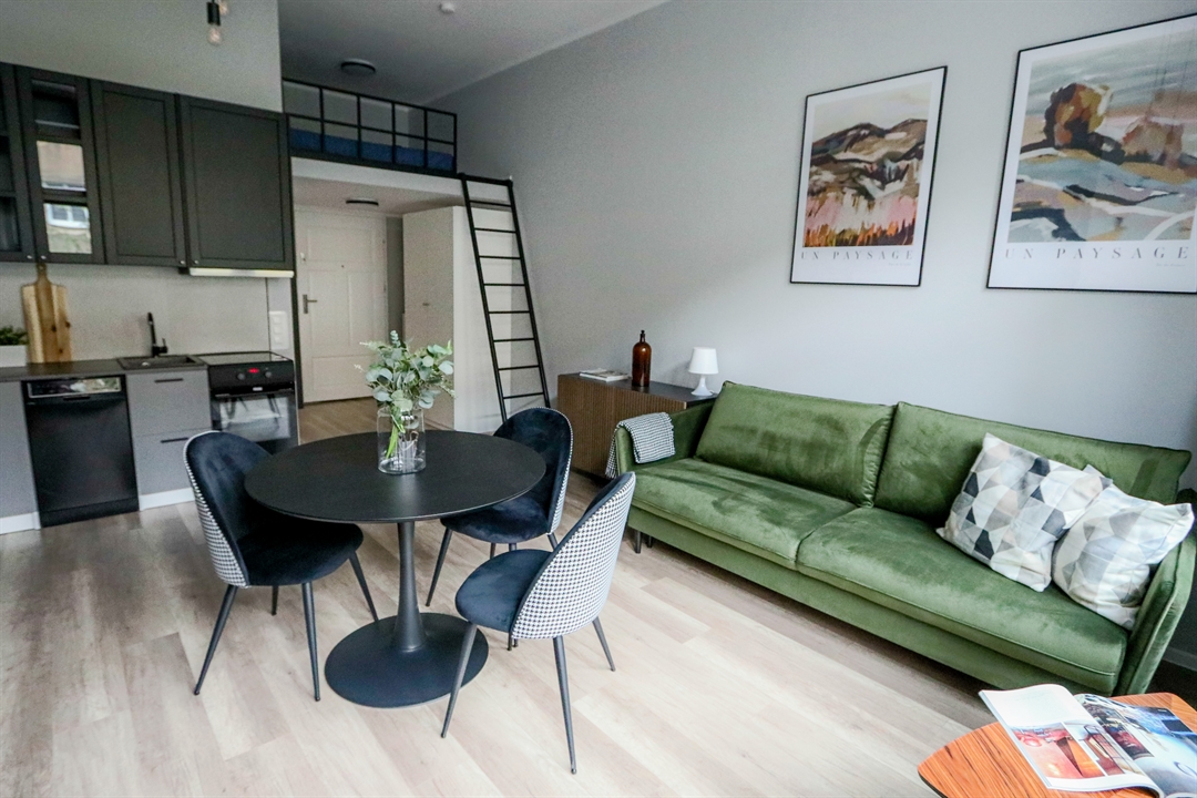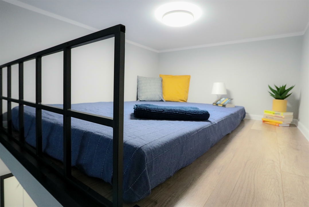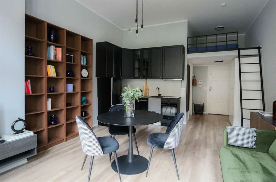 Mieszkanie o powierzchni 30 m² zostało zaprojektowane w sposób maksymalnie funkcjonalny, a dodatkowa antresola z częścią sypialnianą znacząco zwiększa przestrzeń użytkową i nadaje wnętrzu unikalny, loftowy klimat. Lokal usytuowany jest na pierwszym piętrze pięknie odrestaurowanej kamienicy wyposażonej w windę, co stanowi rzadko spotykane udogodnienie w tego typu budynkach.