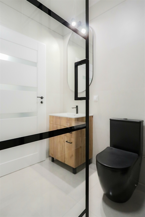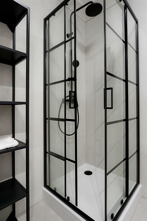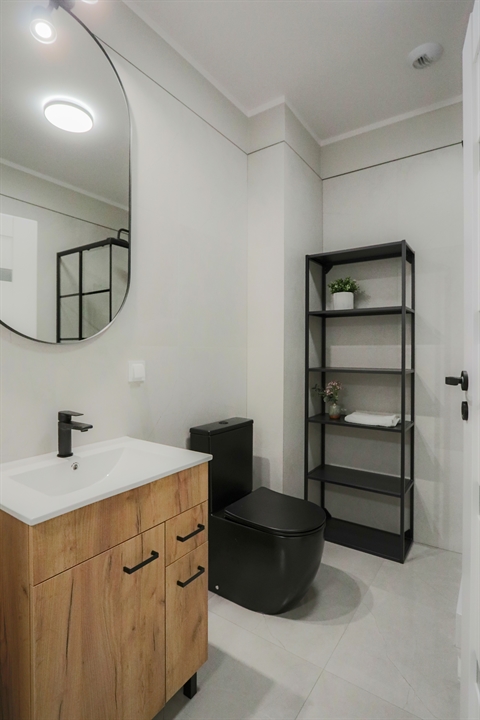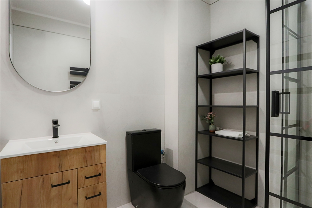 Łazienka została wykończona z dbałością o detale i oferuje kabinę prysznicową z funkcją hydromasażu, dużą umywalkę z szafką, podświetlane lustro, pralkę oraz dodatkowy regał.